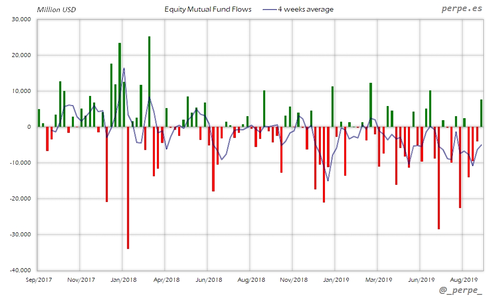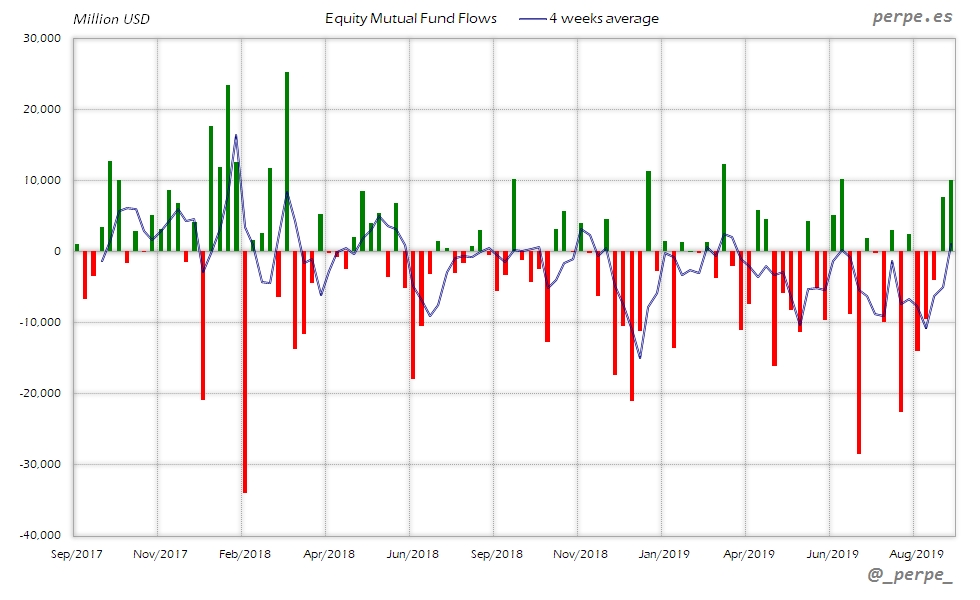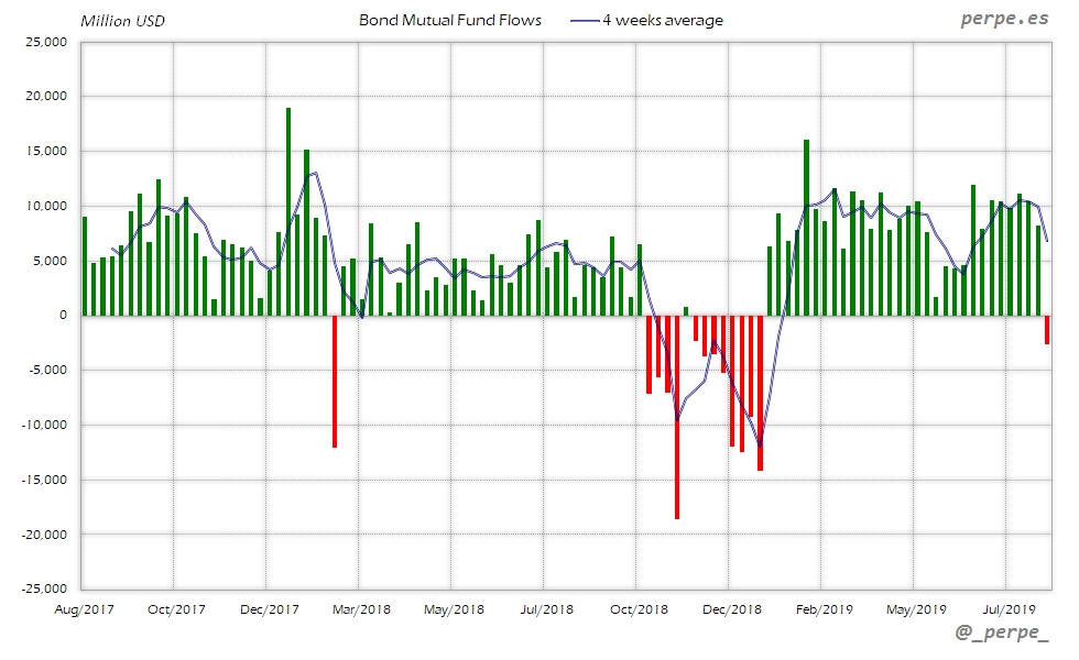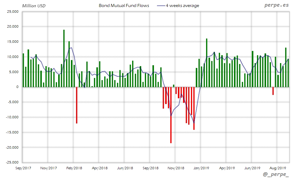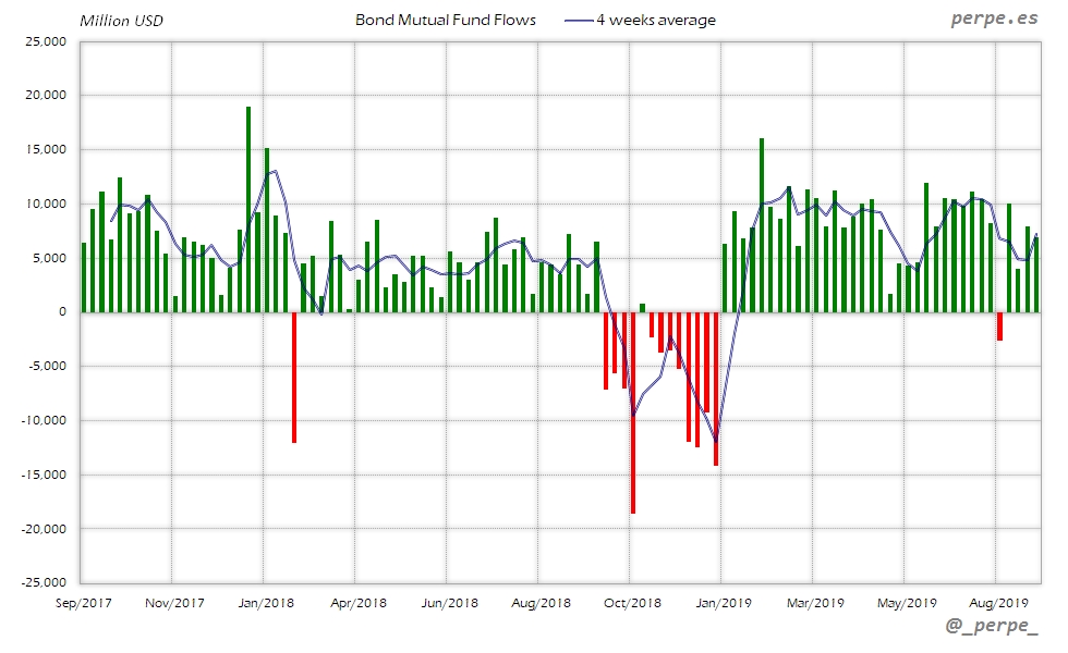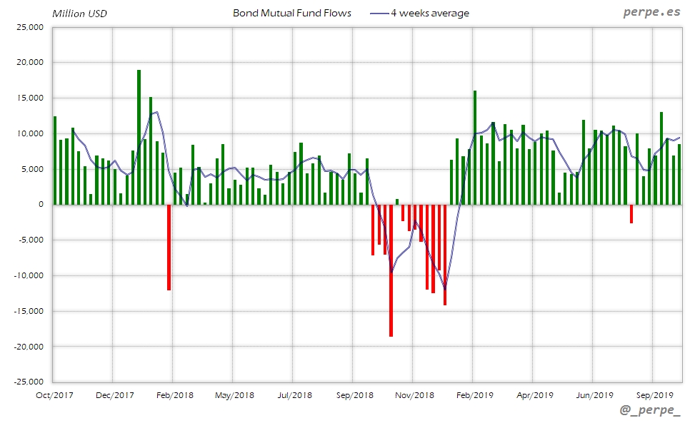 Continúan las suscripciones en fondos y ETF’s de renta fija con la media de 4 semanas en positivo durante 37 semanas consecutivas. En lo que va de año las entradas ya superan los 313.000 millones de dólares, por encima de los 205.000 que los inversores habían suscrito el año pasado en el mismo periodo.