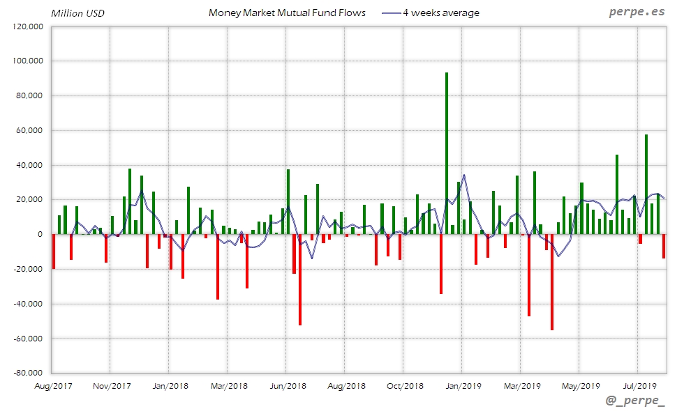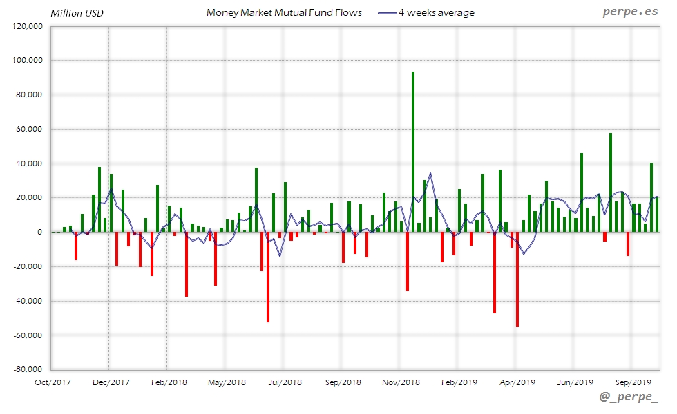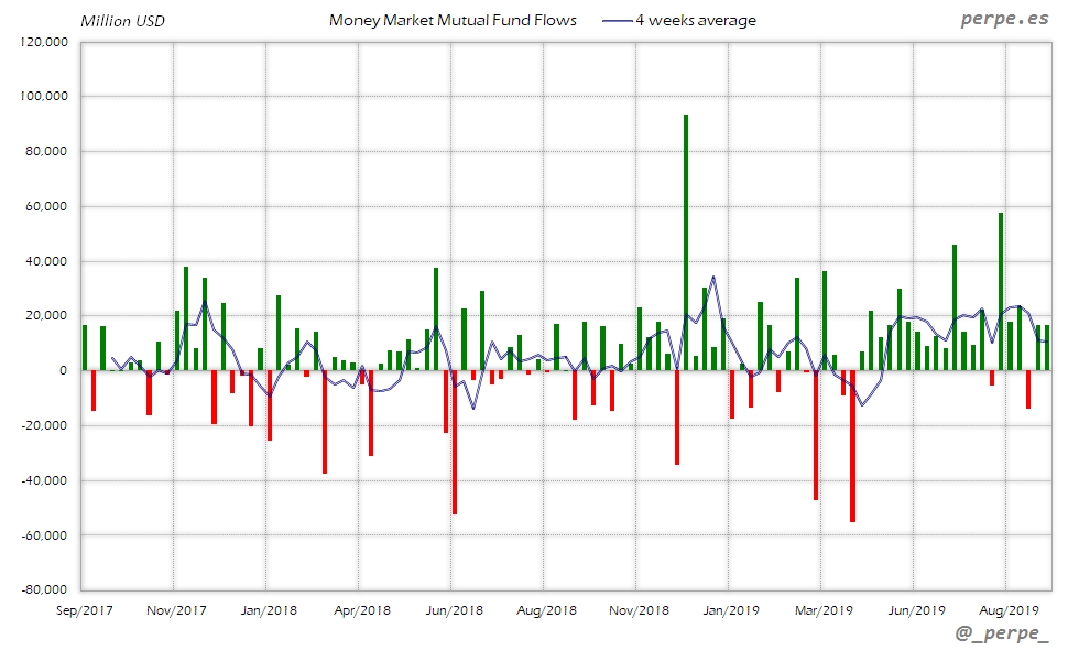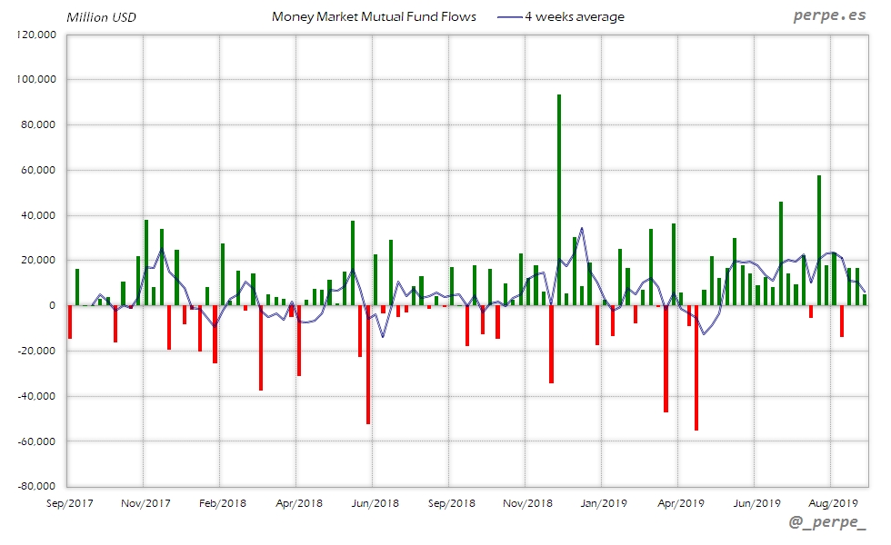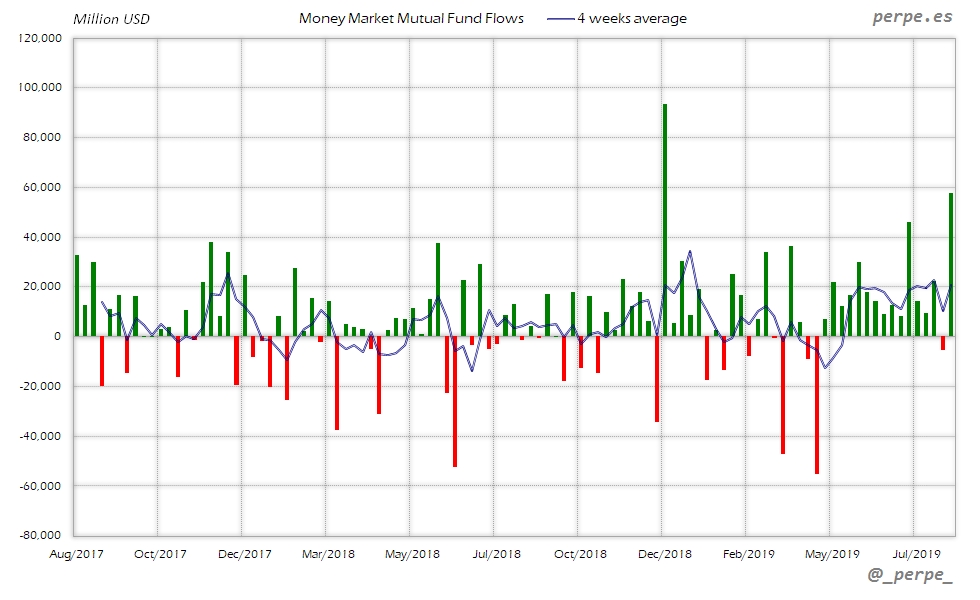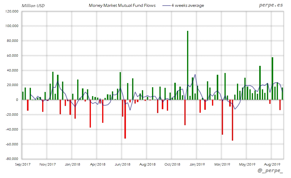 Continúan las suscripciones en fondos y ETF’s de renta fija con la media de 4 semanas en positivo durante 37 semanas consecutivas. En lo que va de año las entradas ya superan los 313.000 millones de dólares, por encima de los 205.000 que los inversores habían suscrito el año pasado en el mismo periodo.