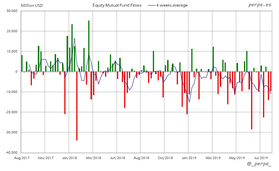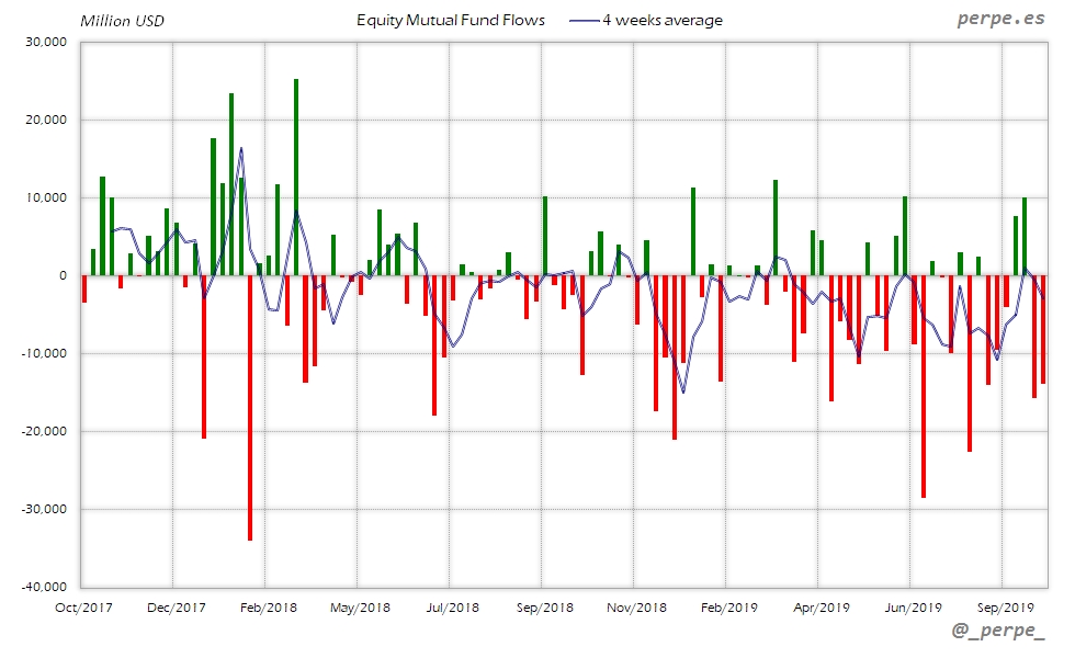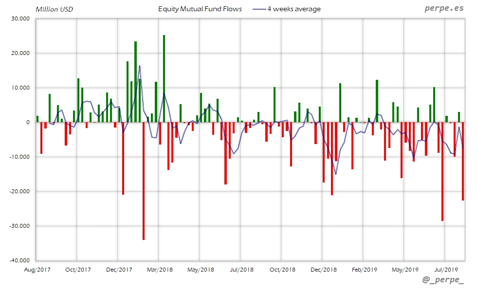 Segunda semana de fuertes reembolsos en fondos y ETF’s de renta variable provocados también por los fondos domésticos. En el acumulado anual el saldo negativo aumenta hasta 154.000 millones de dólares, frente a moderadas salidas por 1.000 millones en las mismas fechas del año anterior.