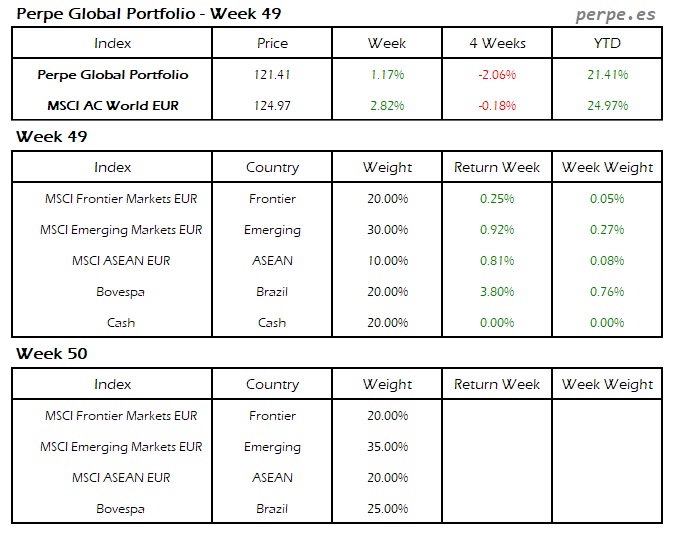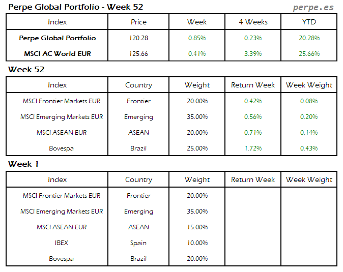 Rebote en la última semana del año con una subida del 0.8% en el Perpe Global Portfolio, el doble que el MSCI AC World EUR.