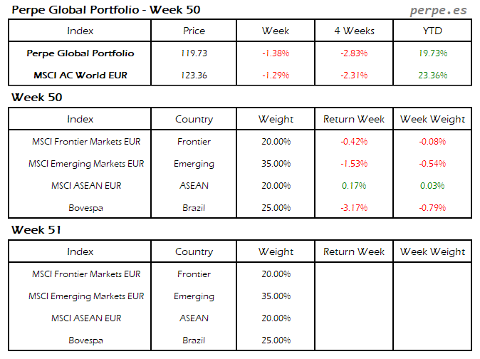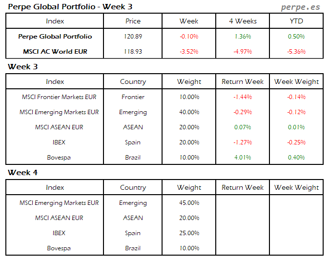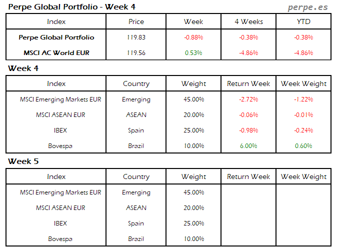 Caída del Bovespa que ha pesado considerablemente en el Perpe Global Portfolio, terminando la semana con una bajada del 1.4%, ligeramente superior a la caída semanal del MSCI AC World EUR.