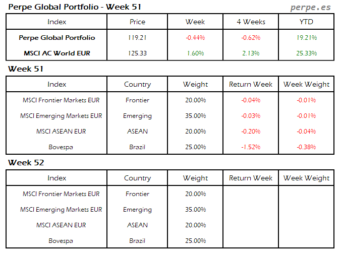 Bajadas moderadas excepto en Brasil que volvió a caer considerablemente, por lo que el Perpe Global Portfolio se dejó un 0.4% mientras el MSCI AC World EUR seguía mostrando fortaleza y rebotaba un 1.6%.