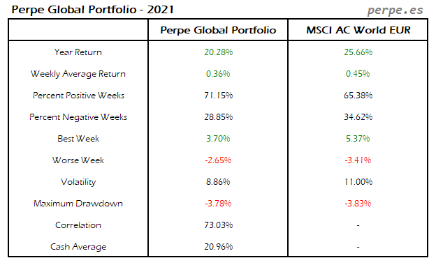 En 2021 la rentabilidad alcanzada por el Perpe Global Portfolio fue del 20.3%, 5 puntos menos que el MSCI AC World EUR, que llegó al 25.7%.
