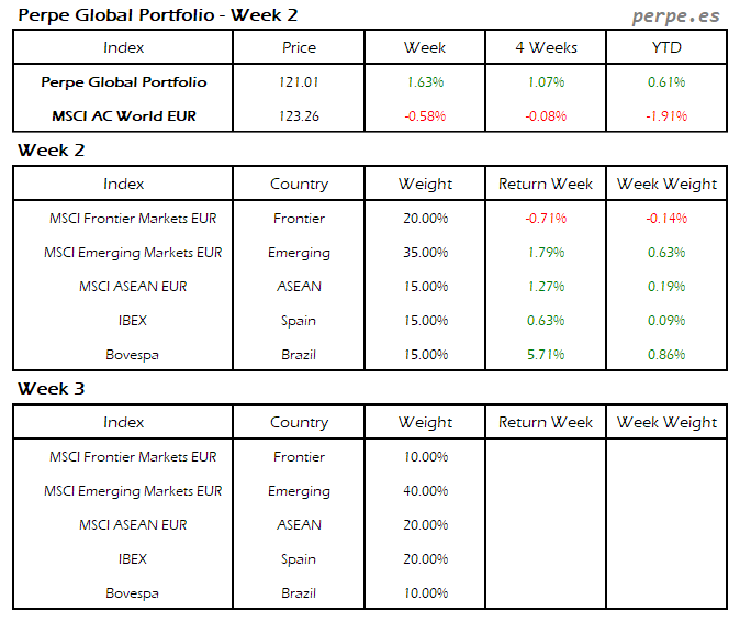 Tan sólo los países frontera han contribuido negativamente esta semana dentro del Perpe Global Portfolio, que terminó con una subida del 1.6%, mientras el MSCI AC World EUR cayó un 0.6%.