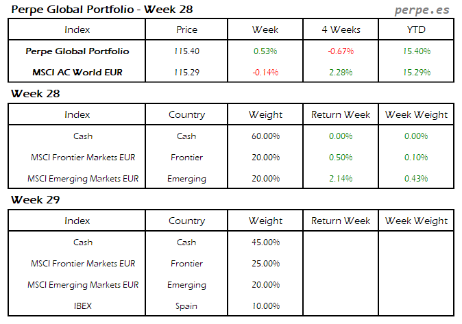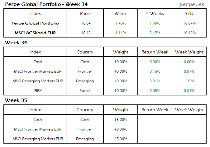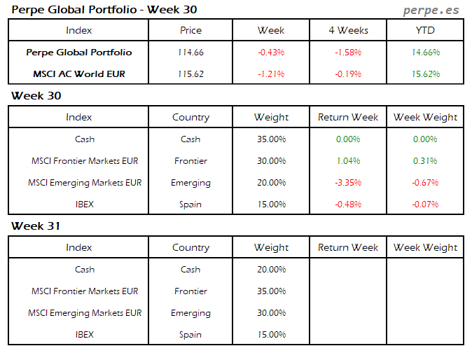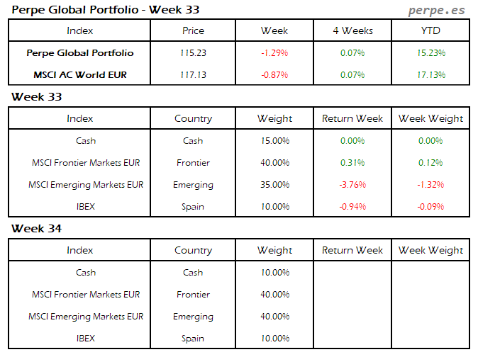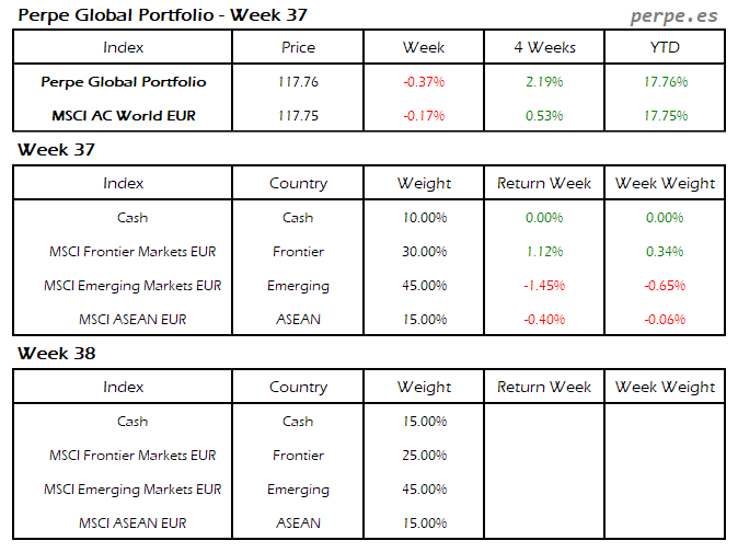 Casi toda la caída del 0.4% esta semana del Perpe Global Portfolio ha sido debida a los emergentes, todavía afectados por China, que también ha tenido impacto negativo, aunque menor, en los países de ASEAN. La bajada en el MSCI AC World EUR ha sido más moderada, de un 0.2%.