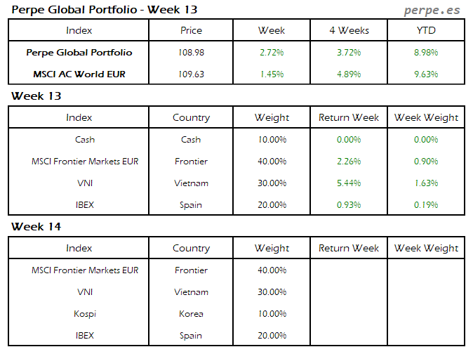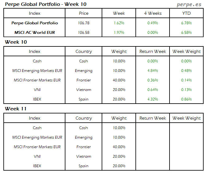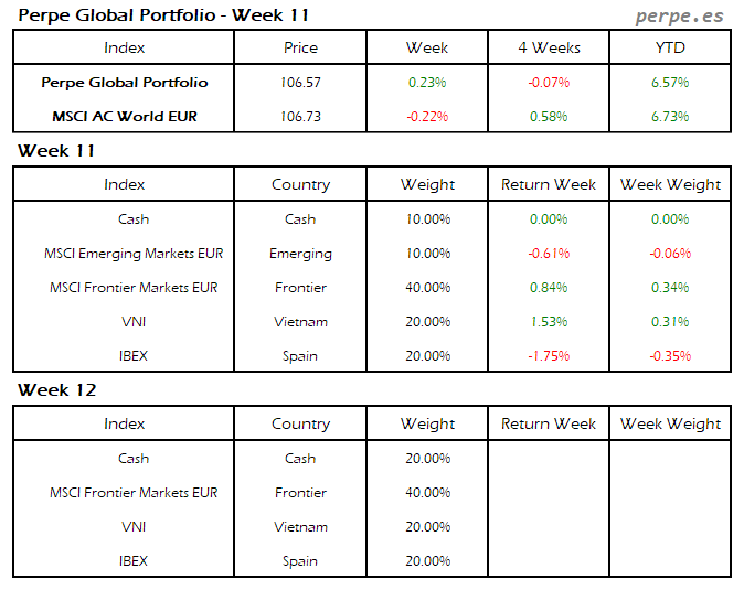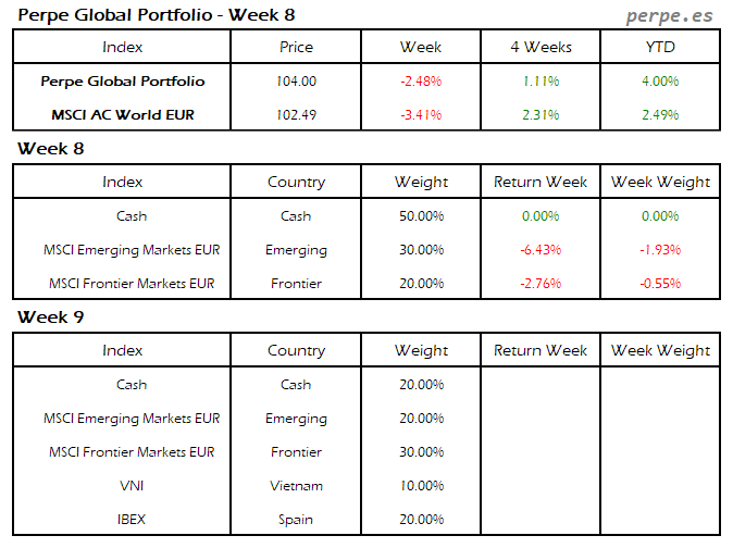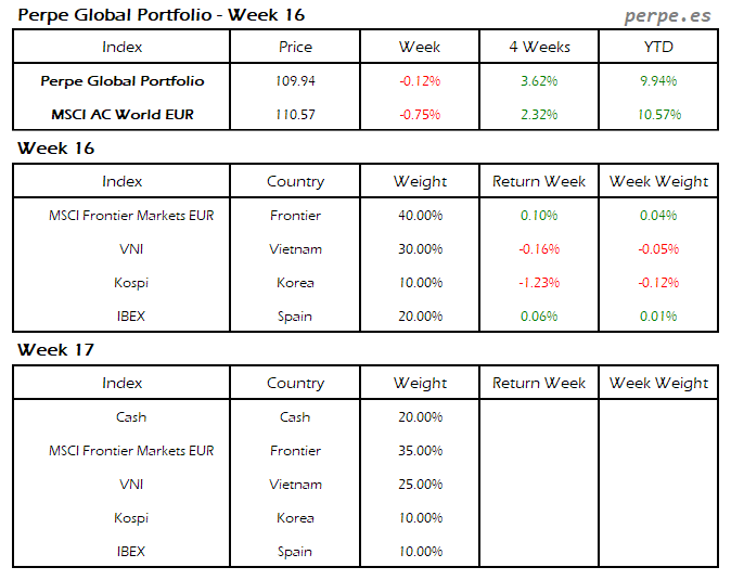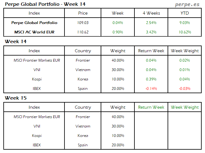 Moderada subida en el Perpe Global Portfolio esta semana del 0.2%, mientras el MSCI AC World EUR cayó exactamente en la misma proporción.