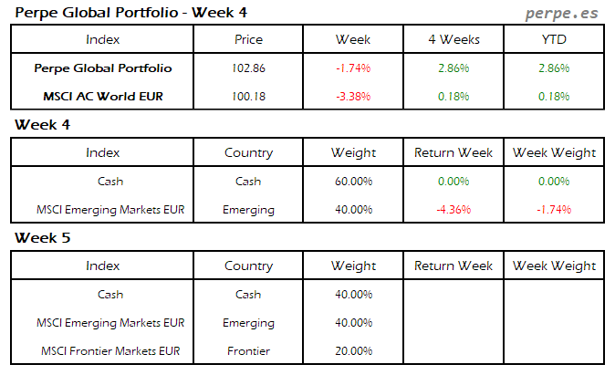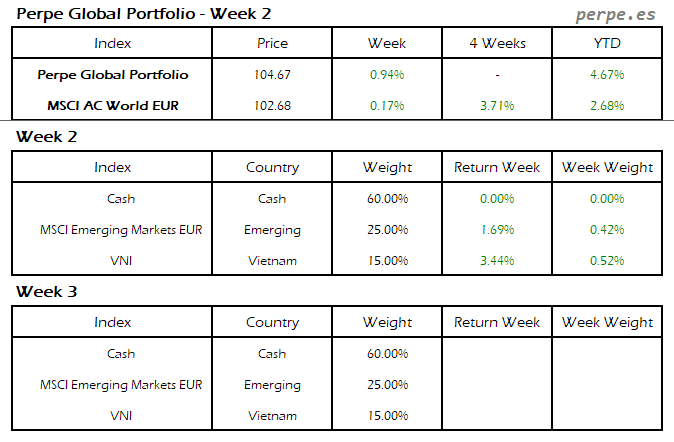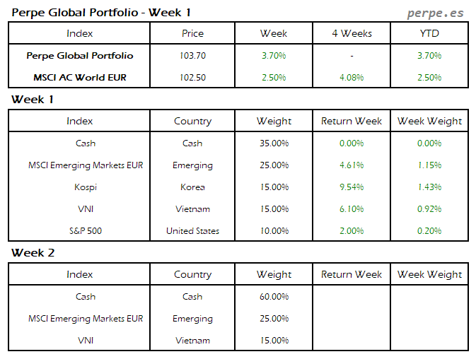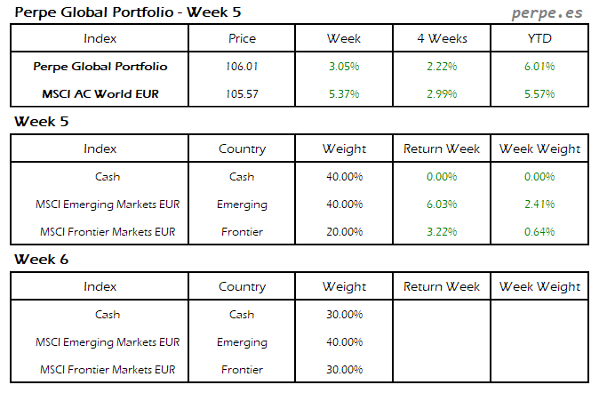 La rentabilidad semanal de dicha cartera ideal se obtendrá a partir de la individual de cada índice multiplicada por la ponderación asignada.