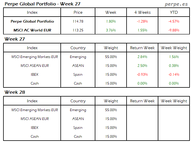 Subida semanal del 0.7% en el Perpe Global Portfolio, contribuyendo positivamente todos los índices excepto el IBEX 35, mientras que la bajada en el MSCI AC World EUR fue del 2.7%.