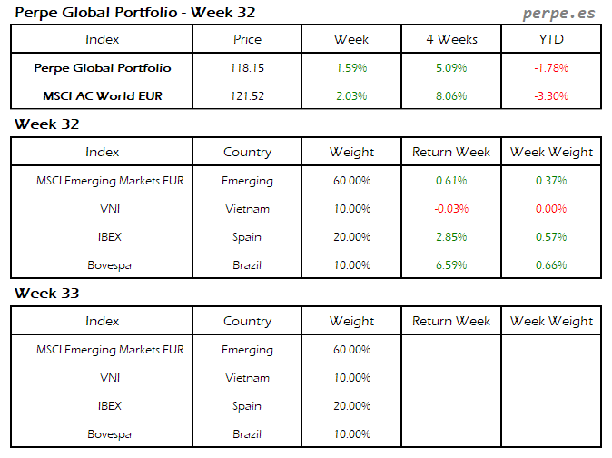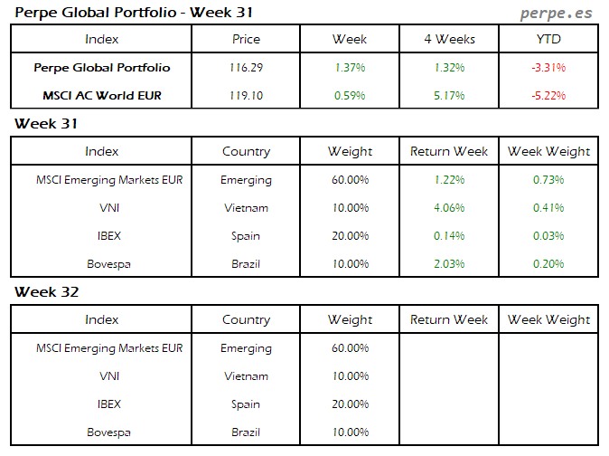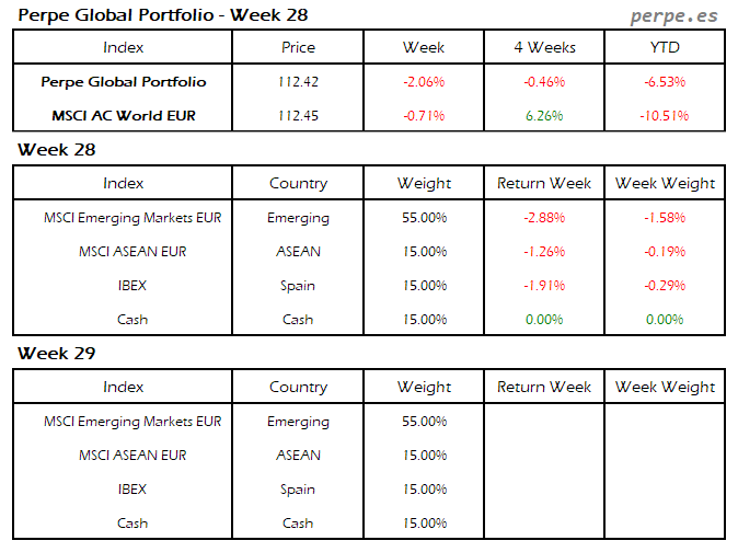 Importante caída superior al 2% en el Perpe Global Portfolio provocada fundamentalmente por los emergentes y, en menor medida, por la bolsa española. Por otra parte, el MSCI AC World EUR sólo bajó un 0.7% esta semana.