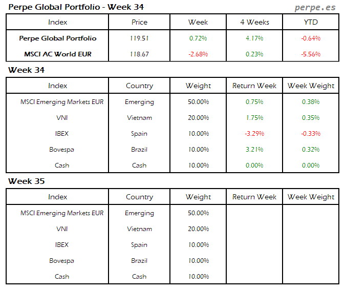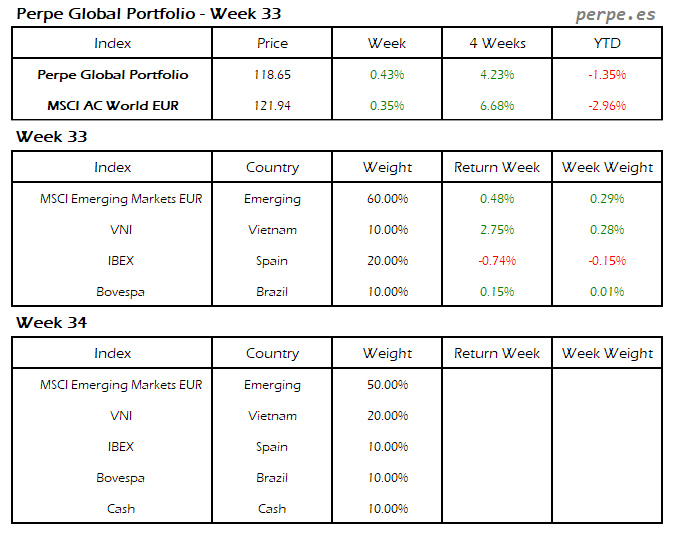 Moderado ascenso esta semana tanto en el Perpe Global Portfolio como en el MSCI AC World EUR, con rentabilidades similares alrededor del 0.4%. Fue positiva la entrada en Vietnam si bien al ser la participación relativamente baja, la contribución ha sido también reducida.