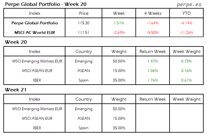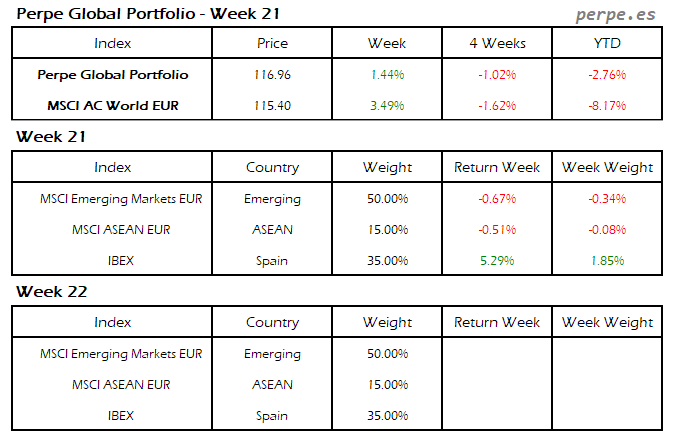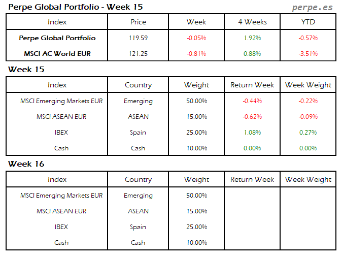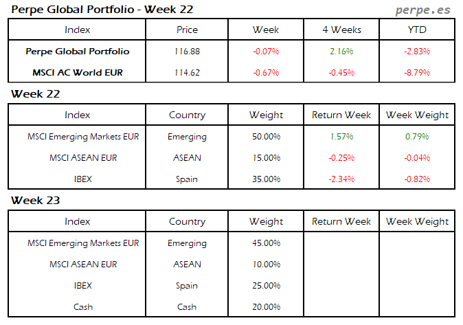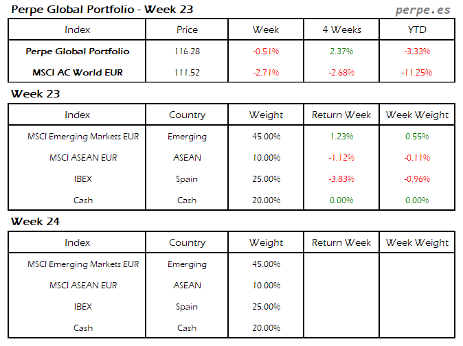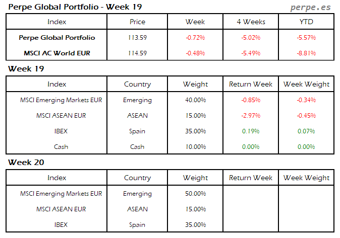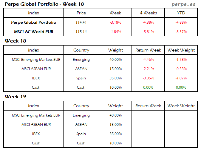 Continuaron las bajadas, con más fuerza en esta ocasión, por lo que el Perpe Global Portfolio se dejó un 2.9%, aunque bastante menos que el 5.1% que cayó el MSCI AC World EUR.