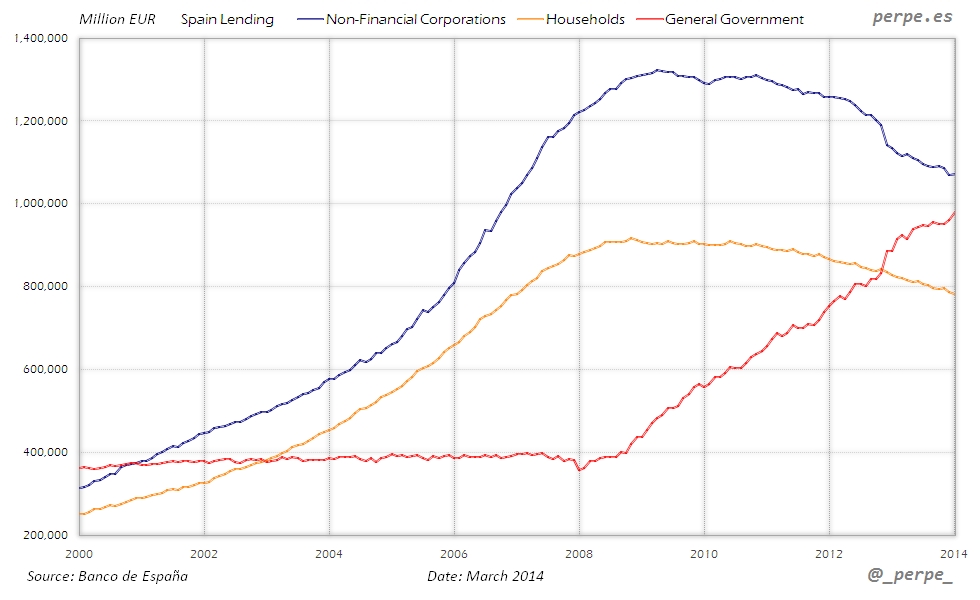 Préstamos a hogares, empresas no financieras y gobierno en España desde 2000 / Lending to households, non-financial corporations and government in Spain since 2000 Posted 20 March, 2014 by perpe