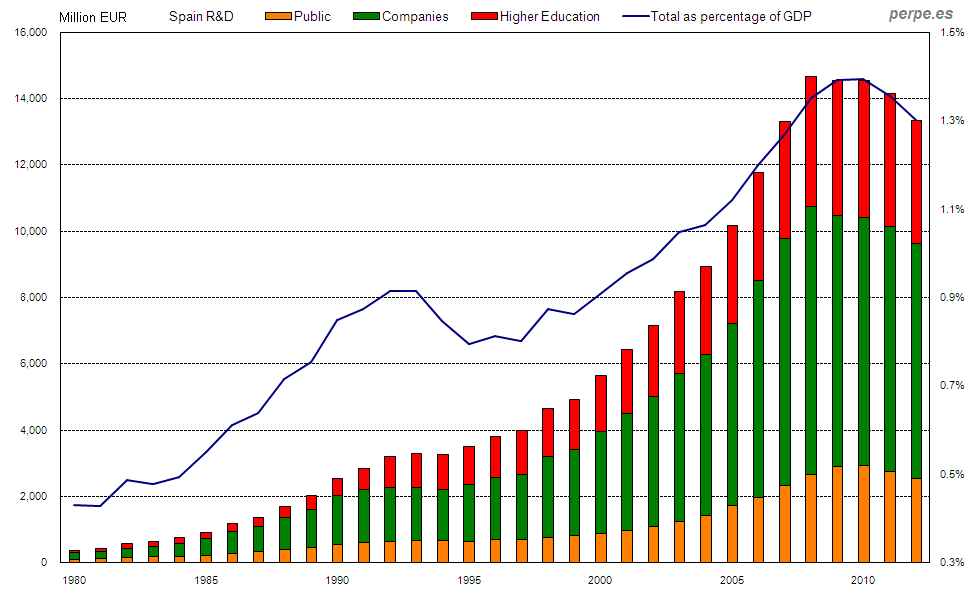 Gasto en I+D en España desde 1980 / R&D expenditure in Spain since 1980 Posted 19 November, 2013 by perpe