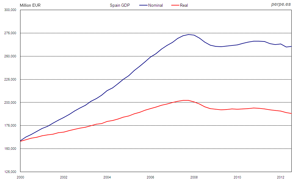 PIB nominal y real en España desde 2000 / GDP nominal and real in Spain since 2000 Posted 28 August, 2013 by perpe