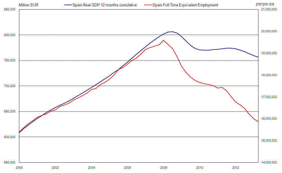 PIB y empleo a tiempo completo equivalente en España desde 2000 / GDP and full time equivalent employment in Spain since 2000 Posted 29 August, 2013 by perpe