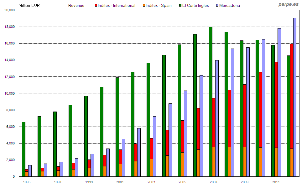 Ventas de Inditex, El Corte Inglés y Mercadona desde 1995 / Revenue of Inditex, El Corte Ingles and Mercadona since 1995 Posted 12 September, 2013 by perpe