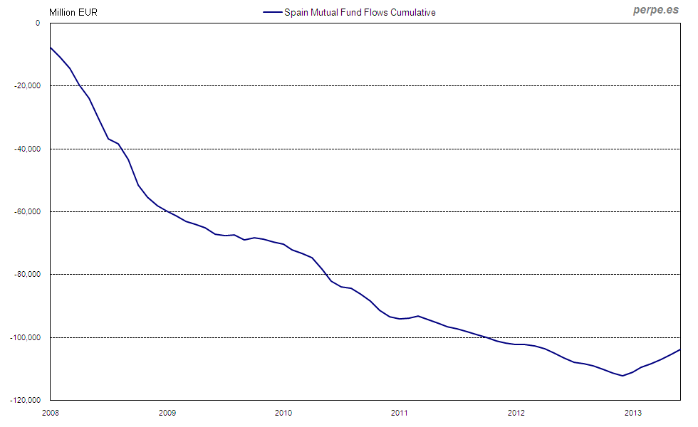 Flujo de fondos de inversión acumulado en España desde 2008 / Mutual funds flows cumulative in Spain since 2008 Posted 6 September, 2013 by perpe