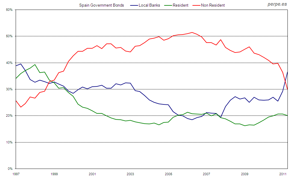 Deuda pública en manos de bancos, residentes y no residentes en España desde 1997 / Banks, residents and non residents holdings of public debt in Spain since 1997 Posted 9 October, 2012 by perpe