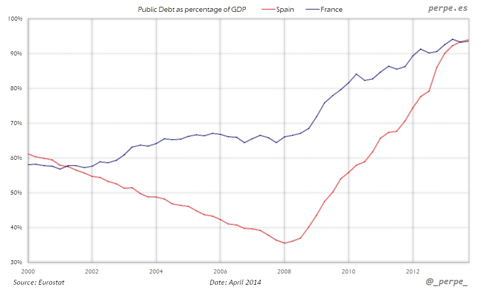 Deuda pública en España y Francia desde 2000 / Public debt in Spain and France since 2000 Posted 24 April, 2014 by perpe