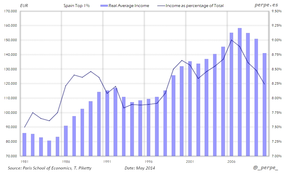 Ingresos del 1% más rico en España desde 1981 / Income of top 1% in Spain since 1981 Posted 5 May, 2014 by perpe