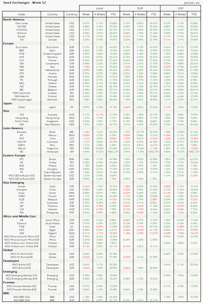 Bolsas Mundiales – Moneda Local, EUR, USD: Semana 52