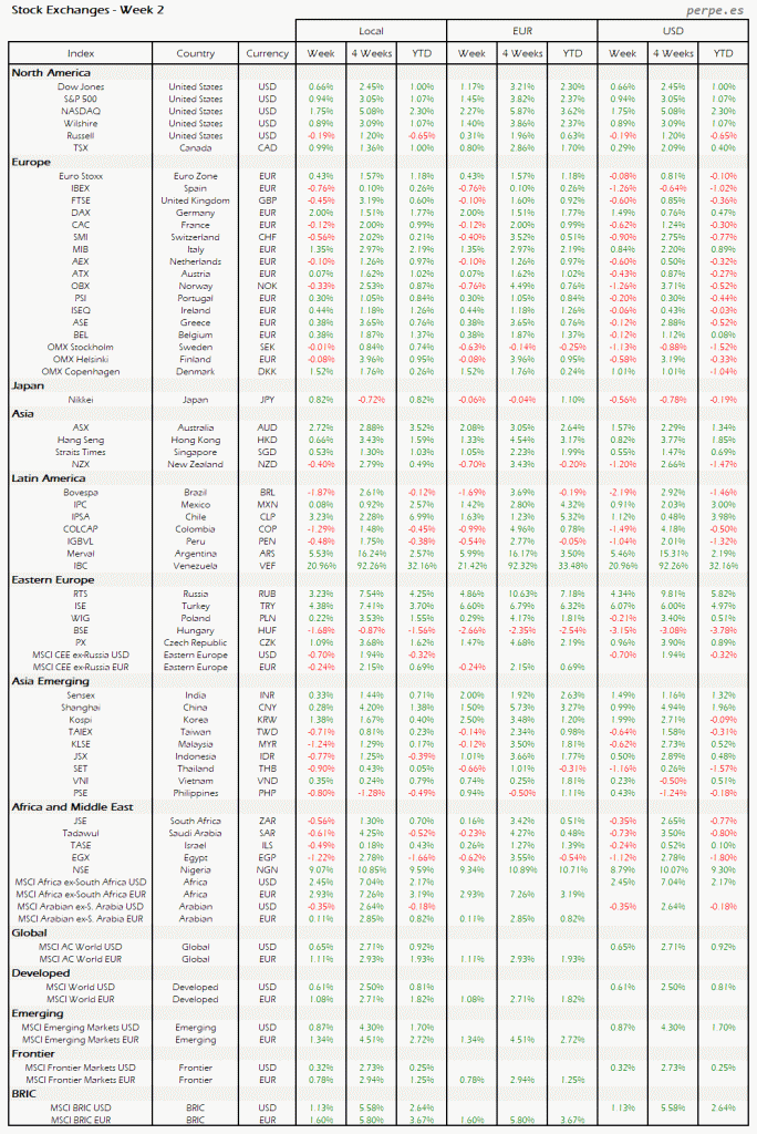 Bolsas Mundiales – Moneda Local, EUR, USD: Semana 2