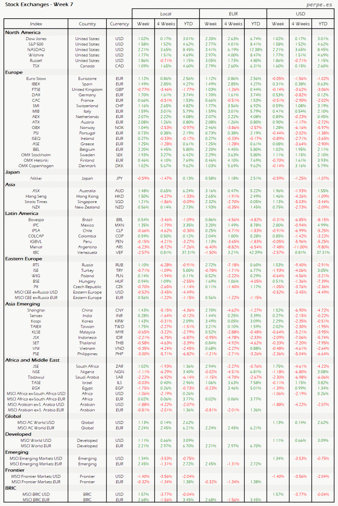 Bolsas Mundiales – Moneda Local, EUR, USD: Semana 7