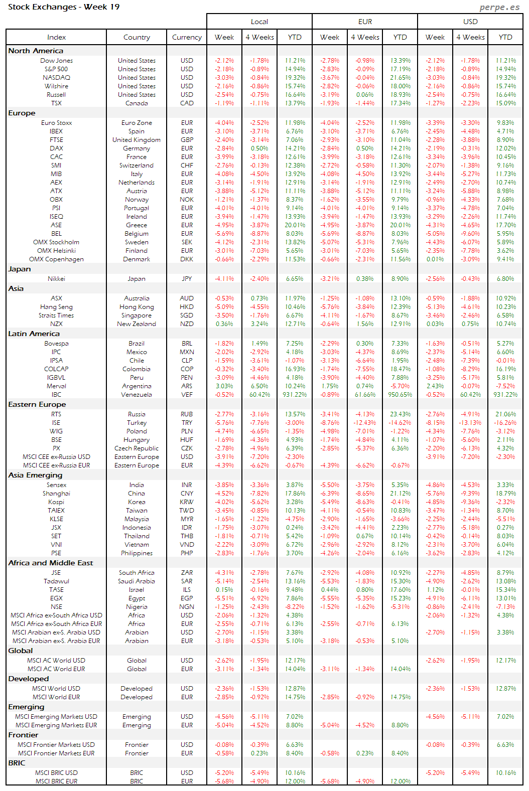Bolsas Mundiales – Moneda Local, EUR, USD: Semana 19