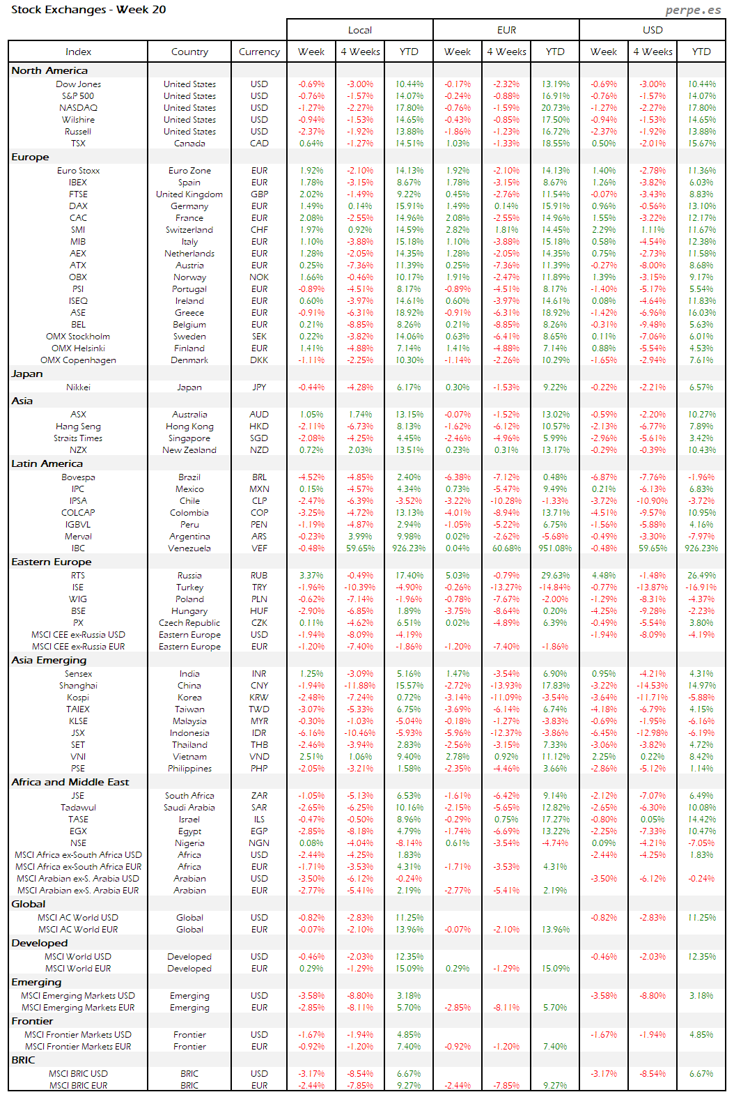 Bolsas Mundiales – Moneda Local, EUR, USD: Semana 20