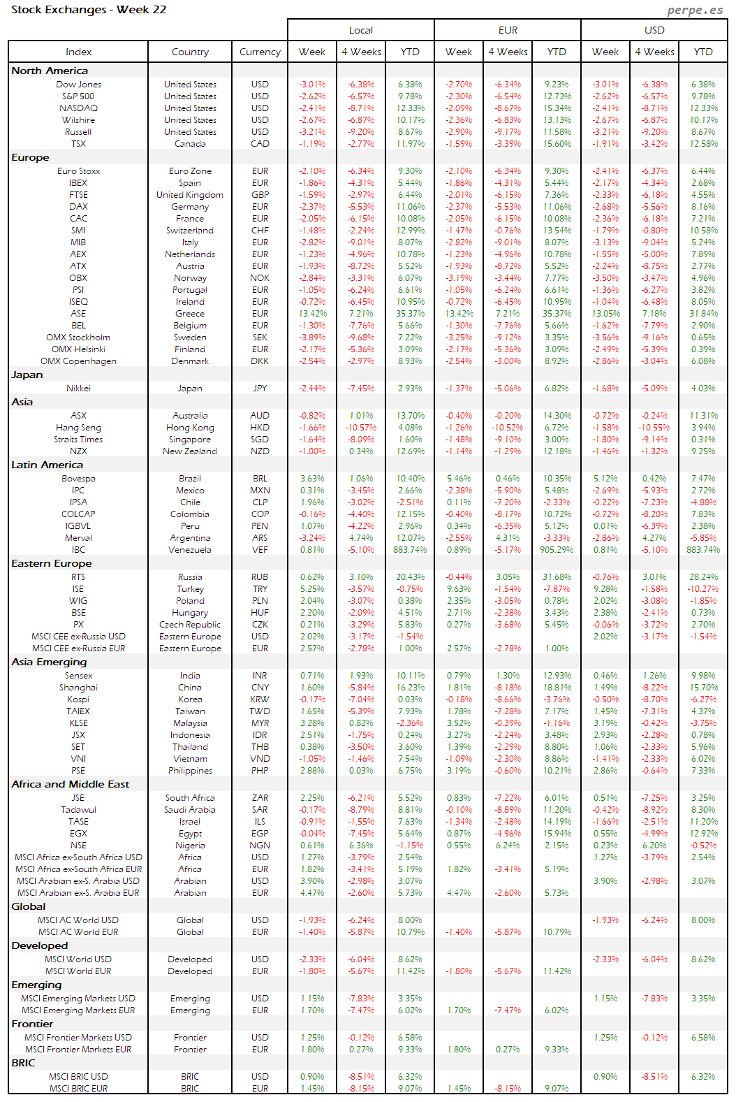 Bolsas Mundiales – Moneda Local, EUR, USD: Semana 22