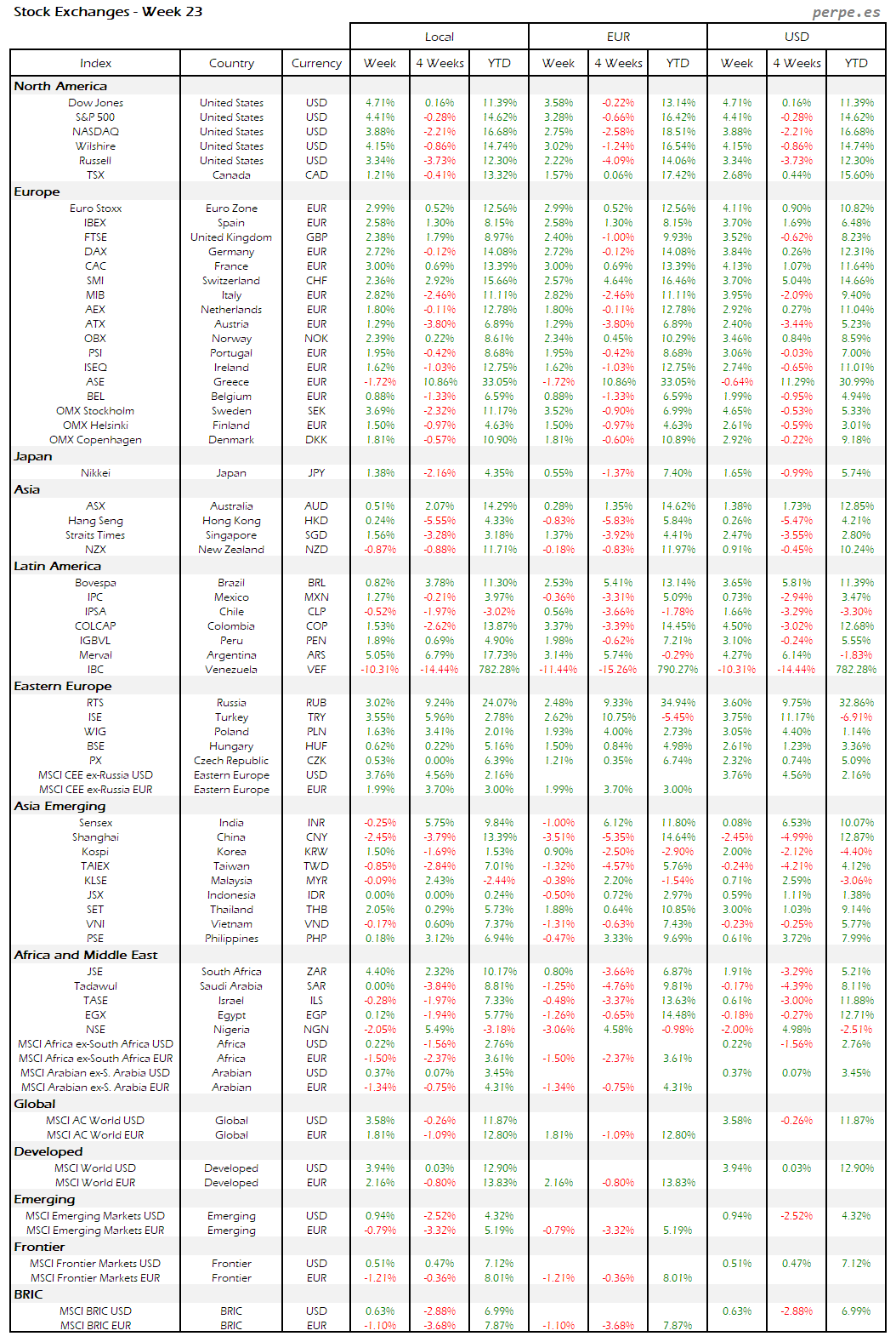 Bolsas Mundiales – Moneda Local, EUR, USD: Semana 23