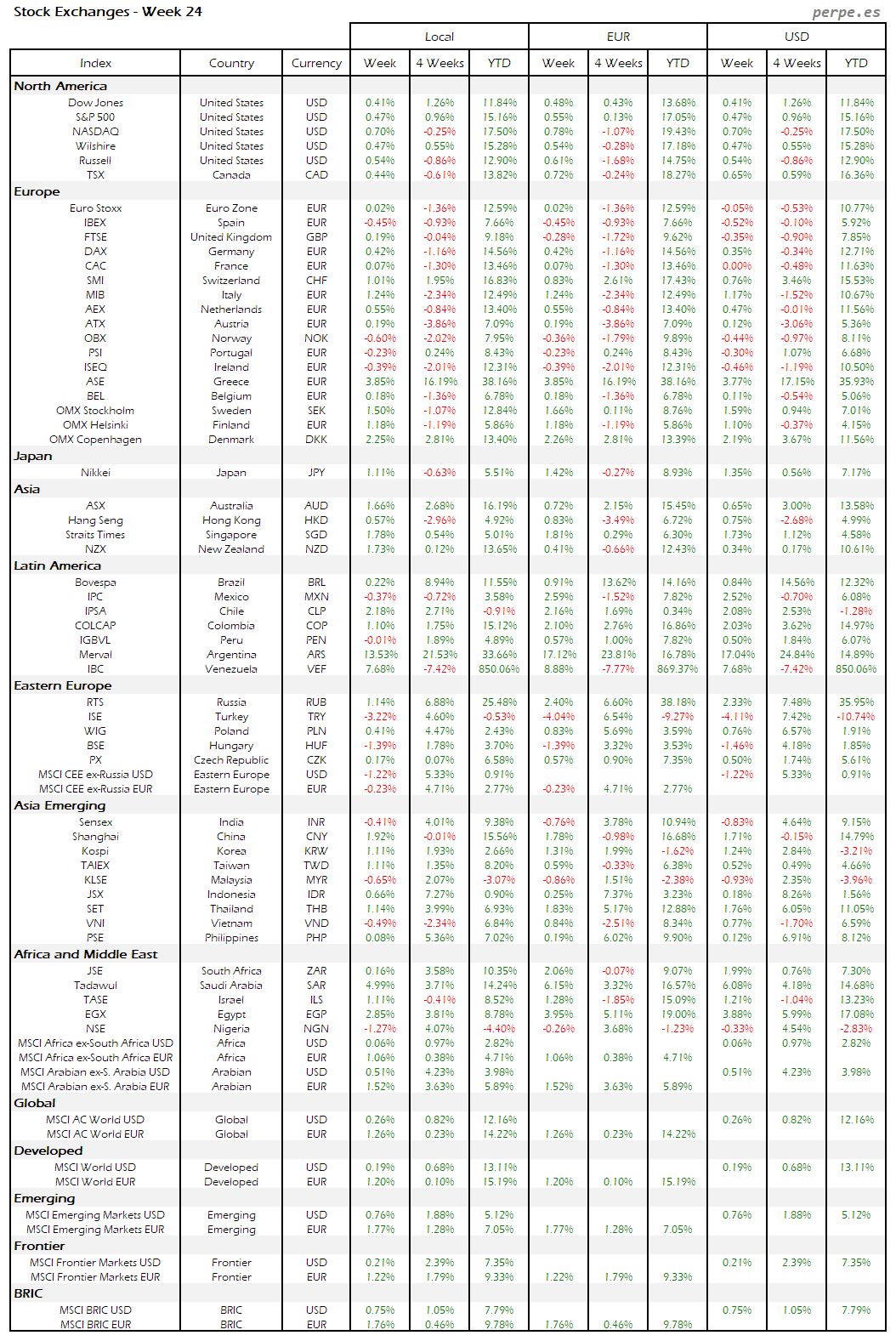 Bolsas Mundiales – Moneda Local, EUR, USD: Semana 24