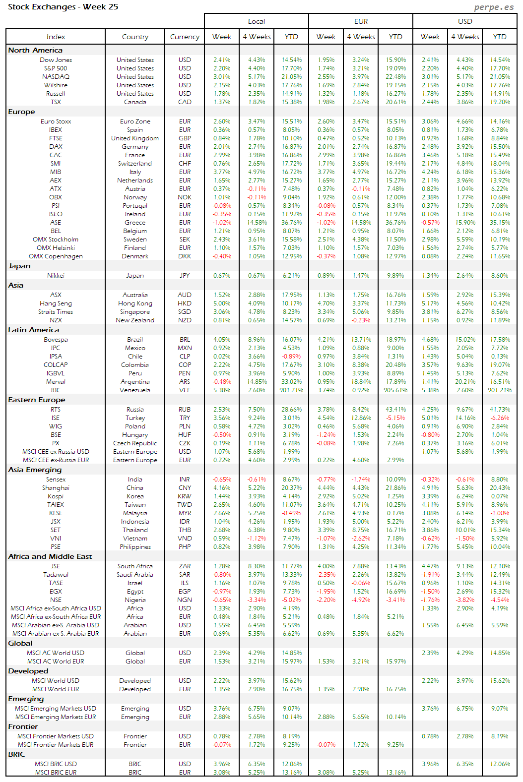 Bolsas Mundiales – Moneda Local, EUR, USD: Semana 25