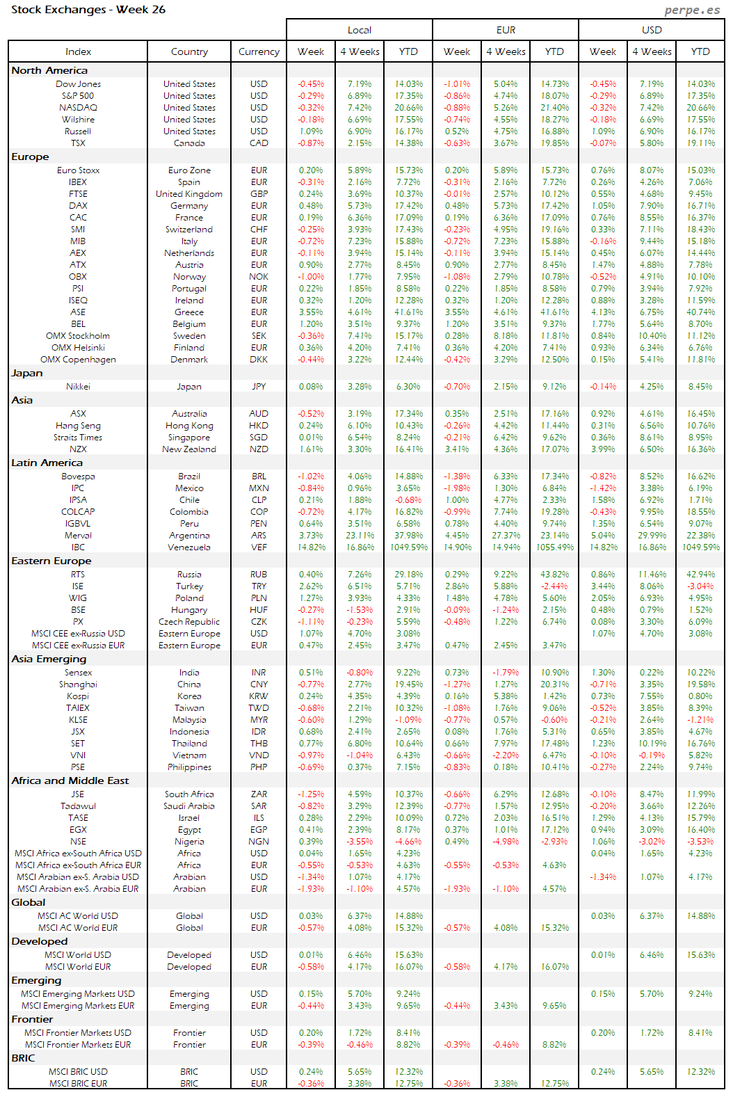 Bolsas Mundiales – Moneda Local, EUR, USD: Semana 26