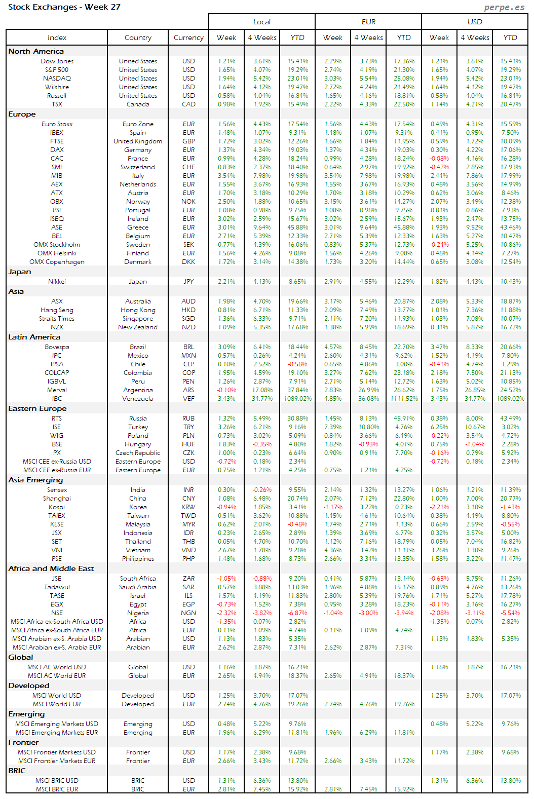 Bolsas Mundiales – Moneda Local, EUR, USD: Semana 27