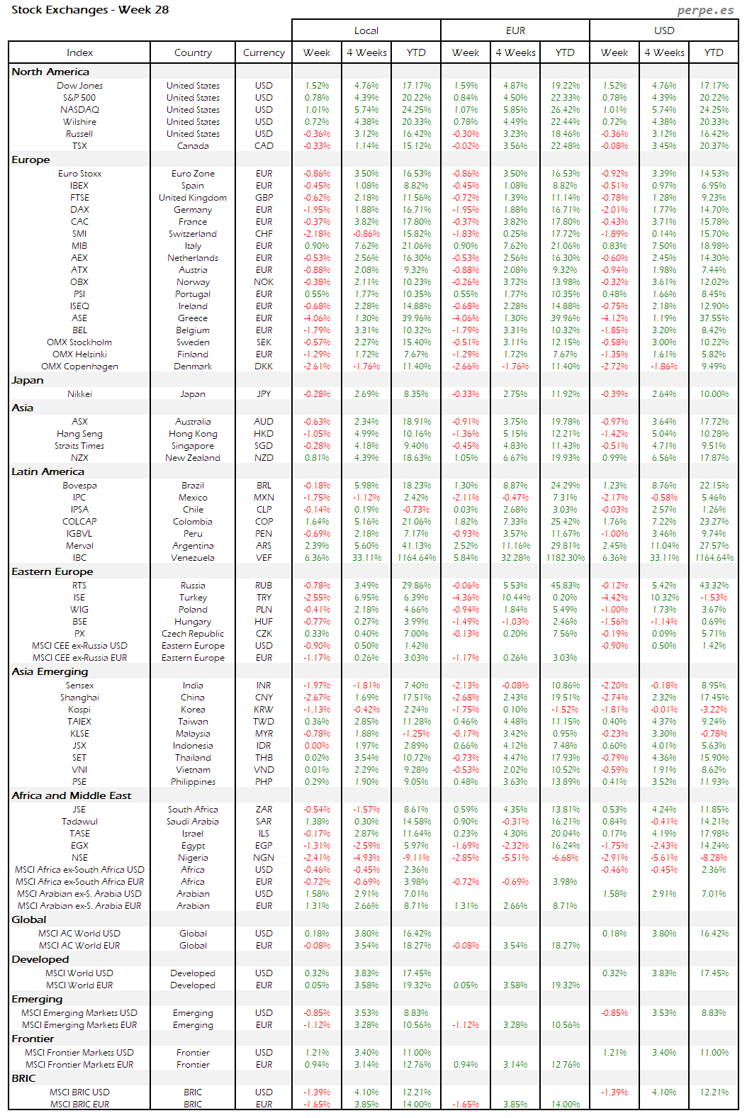 Bolsas Mundiales – Moneda Local, EUR, USD: Semana 28