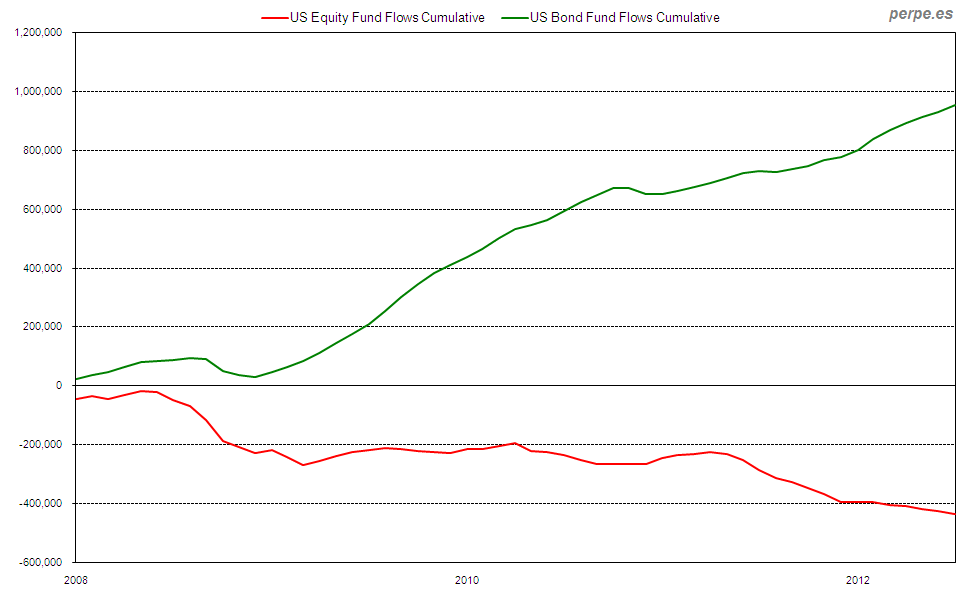 Flujo de fondos de inversión acumulado de acciones y bonos en Estados Unidos desde 2008 / Equity and bond mutual funds flows cumulative in United States since 2008 Posted 6 September, 2012 by perpe