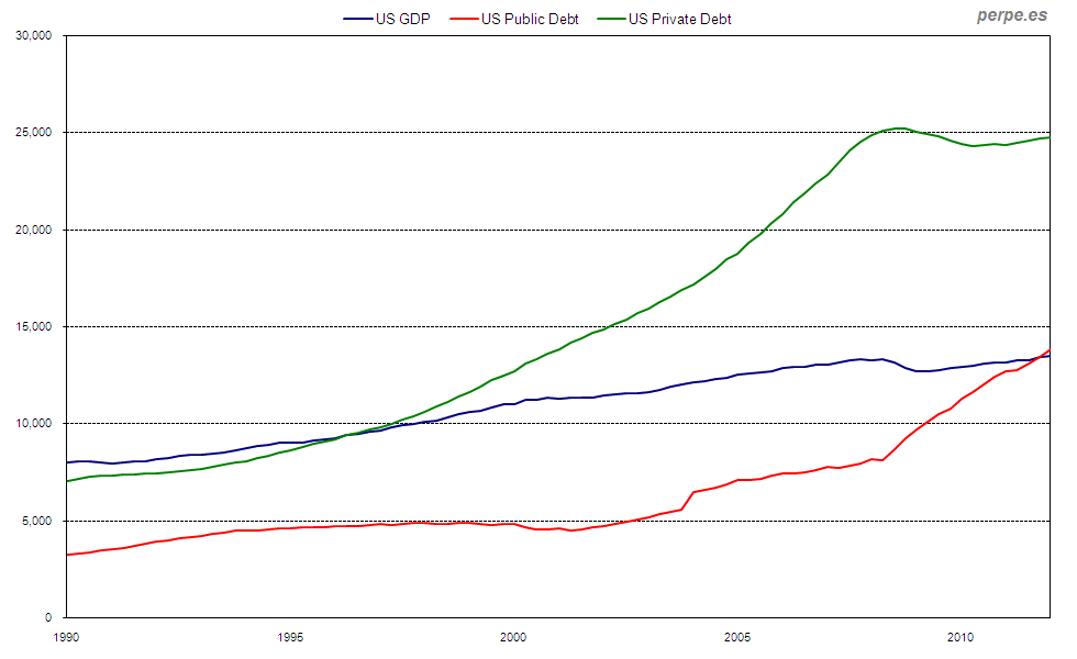 PIB, deuda pública y privada en Estados Unidos desde 1990 / GDP, public and private debt in United States since 1990 Posted 12 September, 2012 by perpe