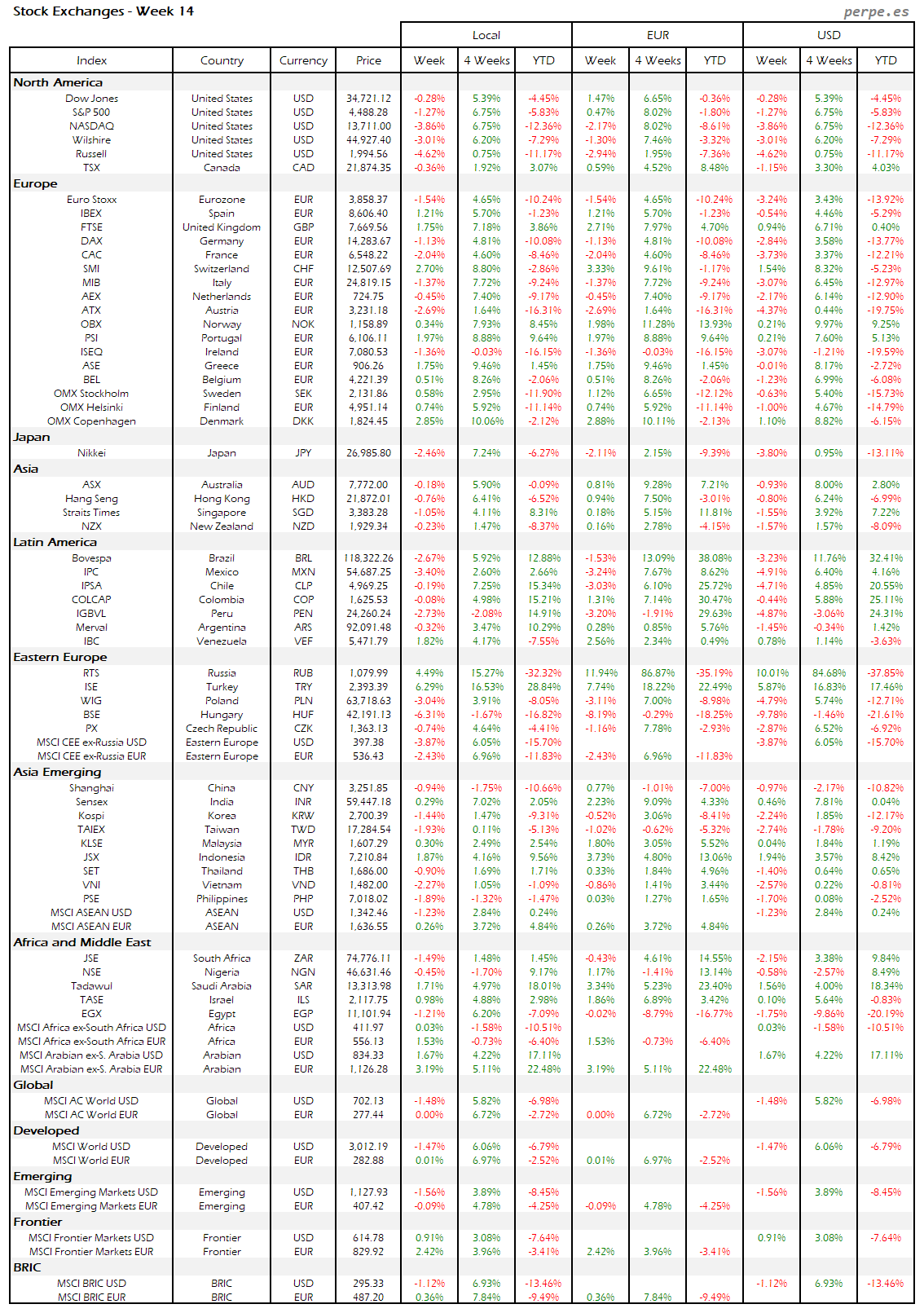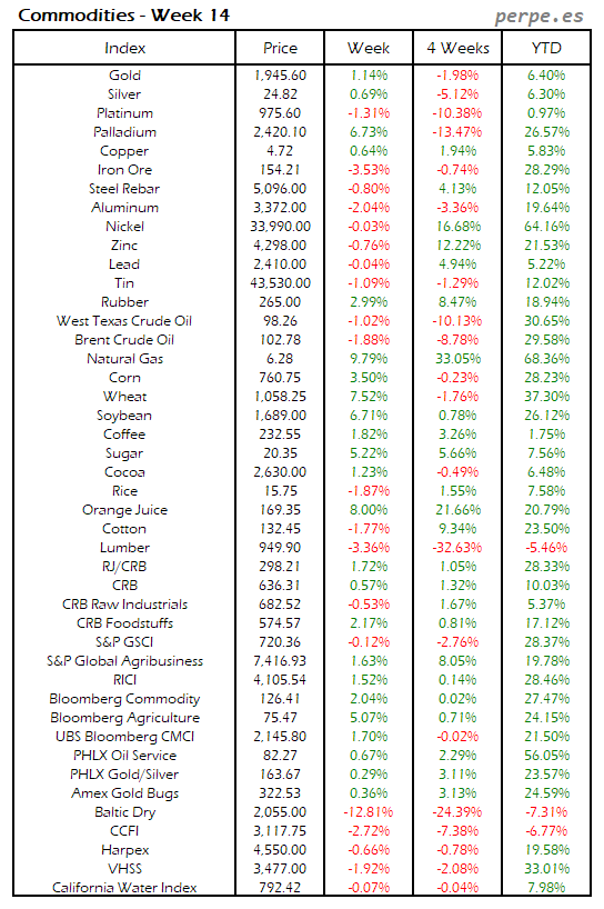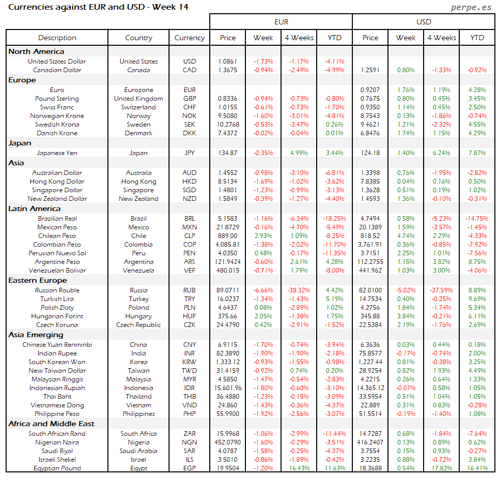 Resumen semanal bolsas, divisas y materias primas: Semana 14