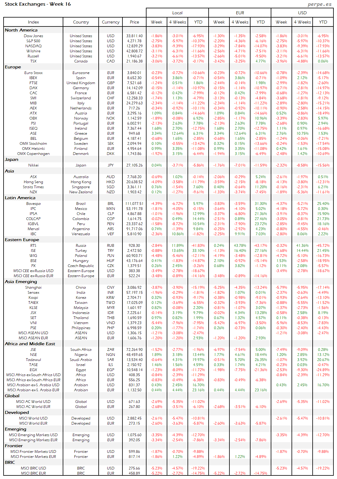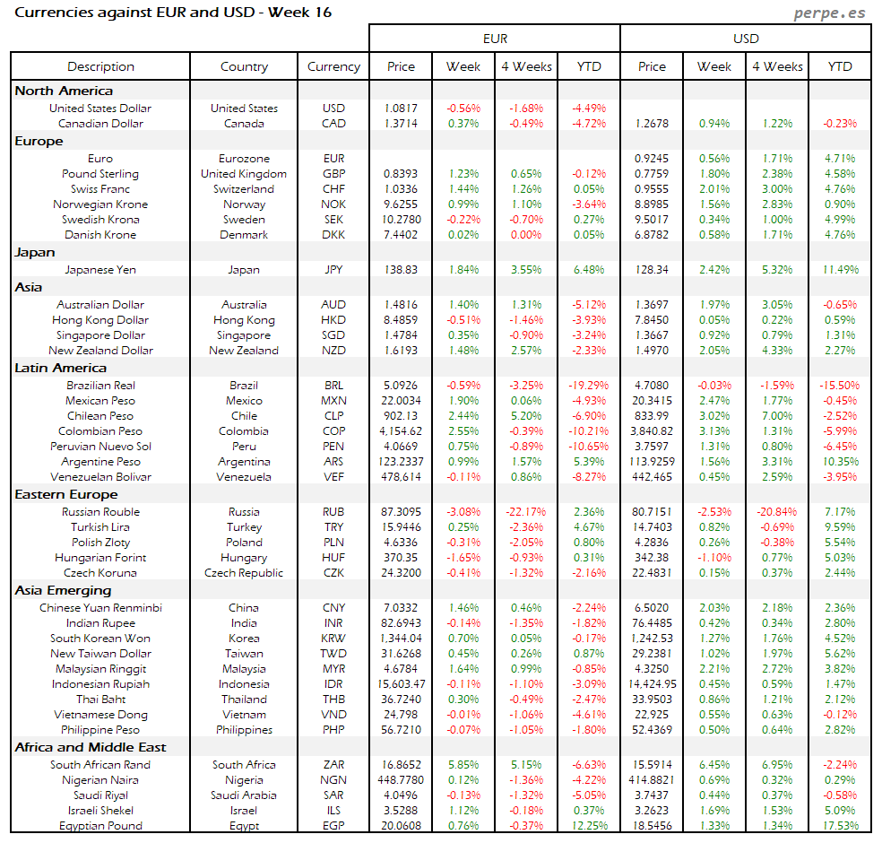 Resumen semanal bolsas, divisas y materias primas: Semana 16