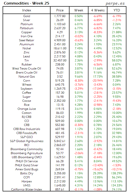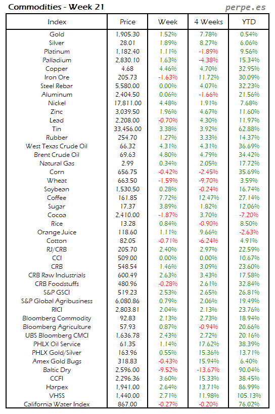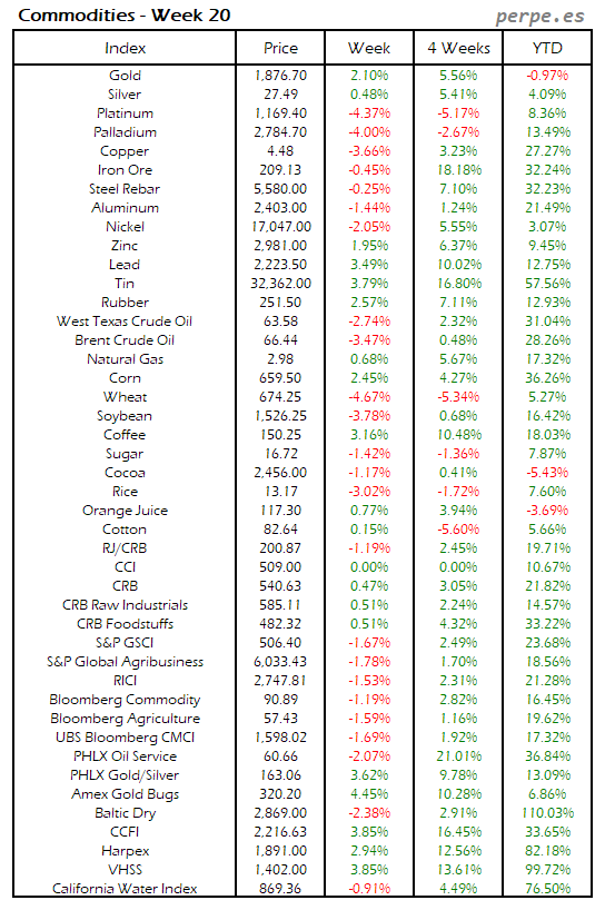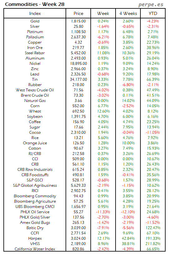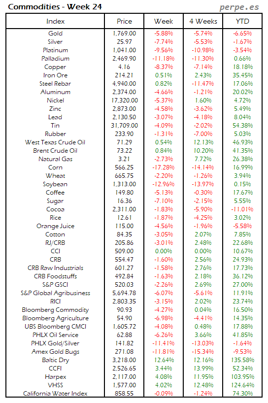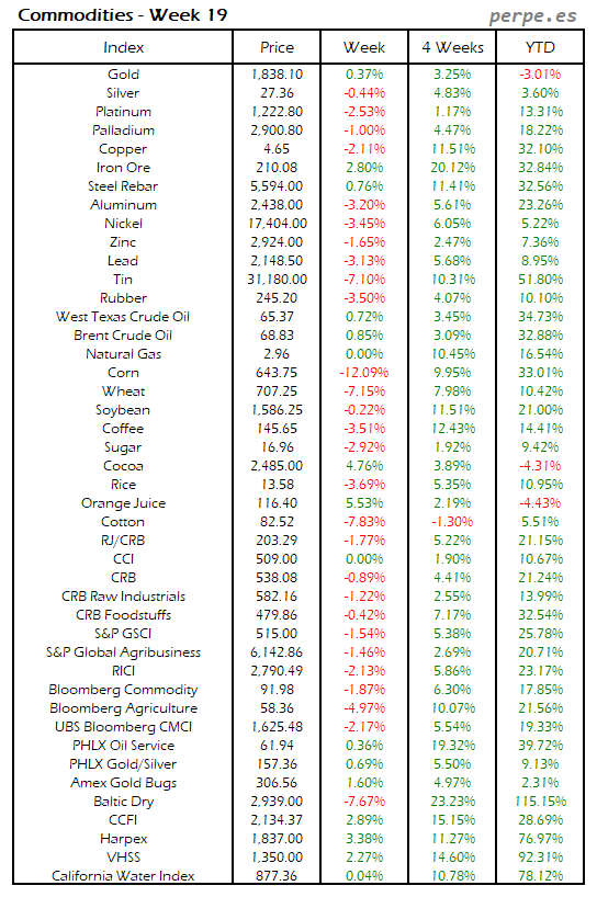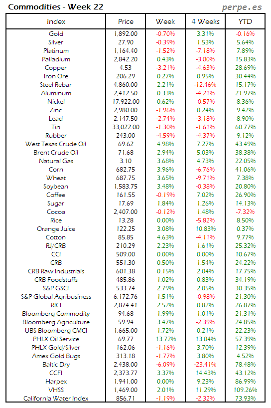 Bajada de las materias primas después de las importantes subidas en las semanas anteriores, con el estaño, trigo, algodón y maíz registrando las mayores caídas por encima del 7%. También la mayoría de metales industriales cerraron en negativo, con la excepción del mineral de hierro subió un 2.8%. El petróleo terminó subiendo un 0.8% en su tercera semana consecutiva de ascensos.