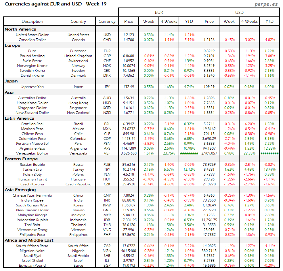 Resumen semanal bolsas, divisas y materias primas: Semana 19
