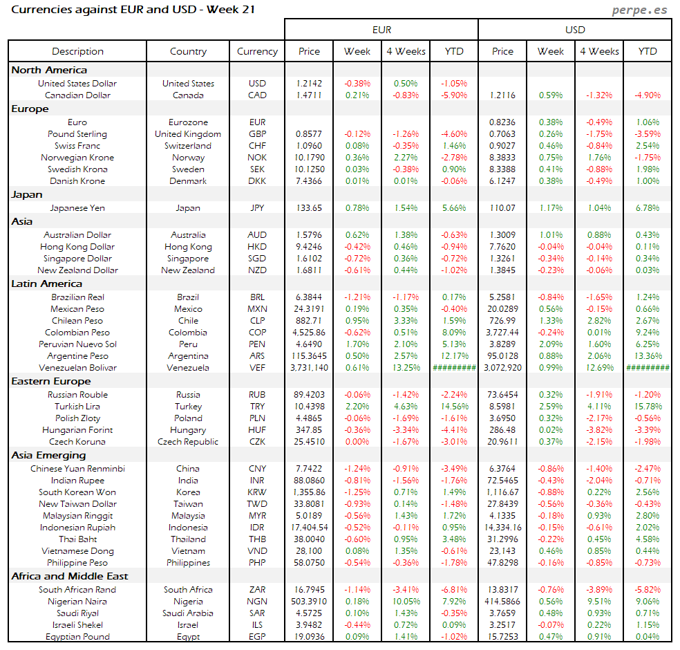 Resumen semanal bolsas, divisas y materias primas: Semana 21
