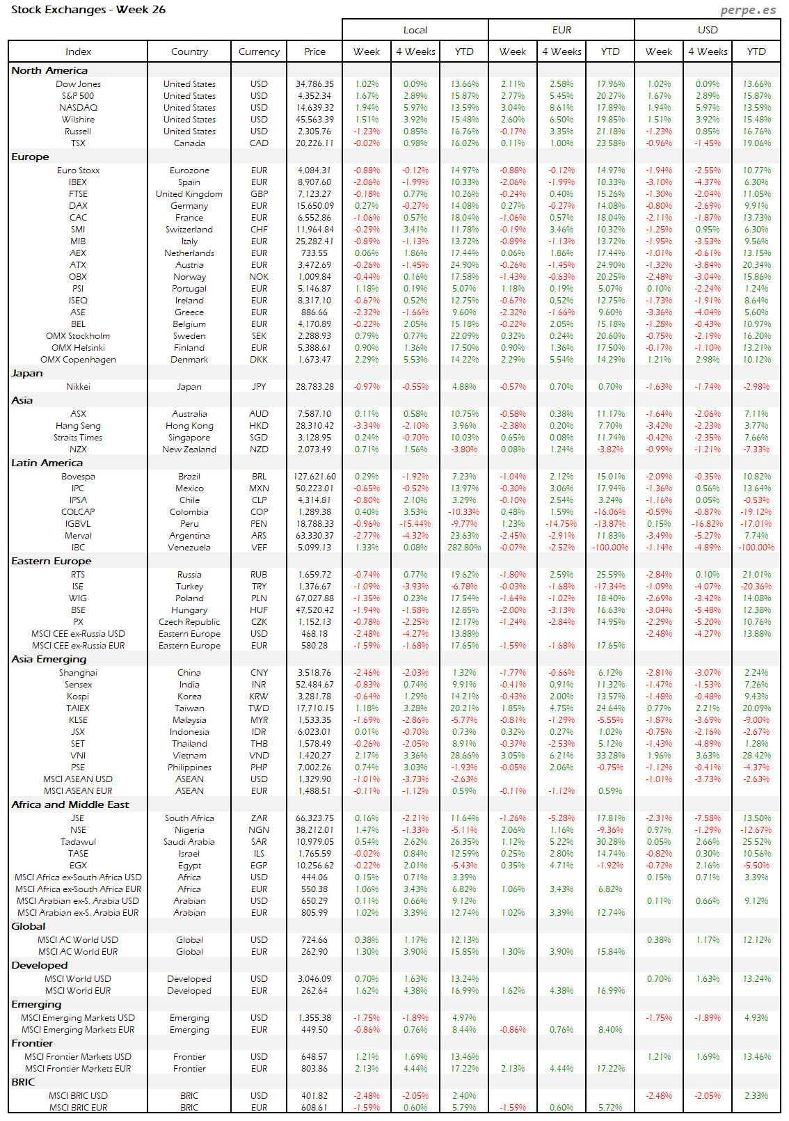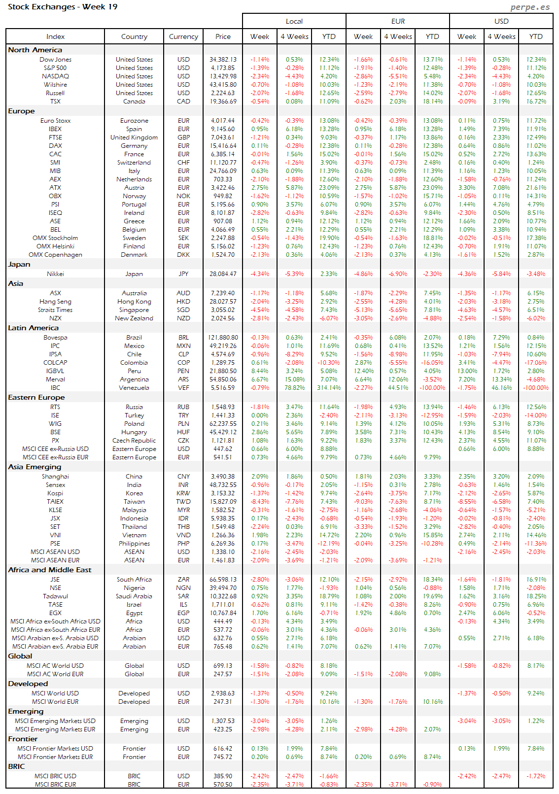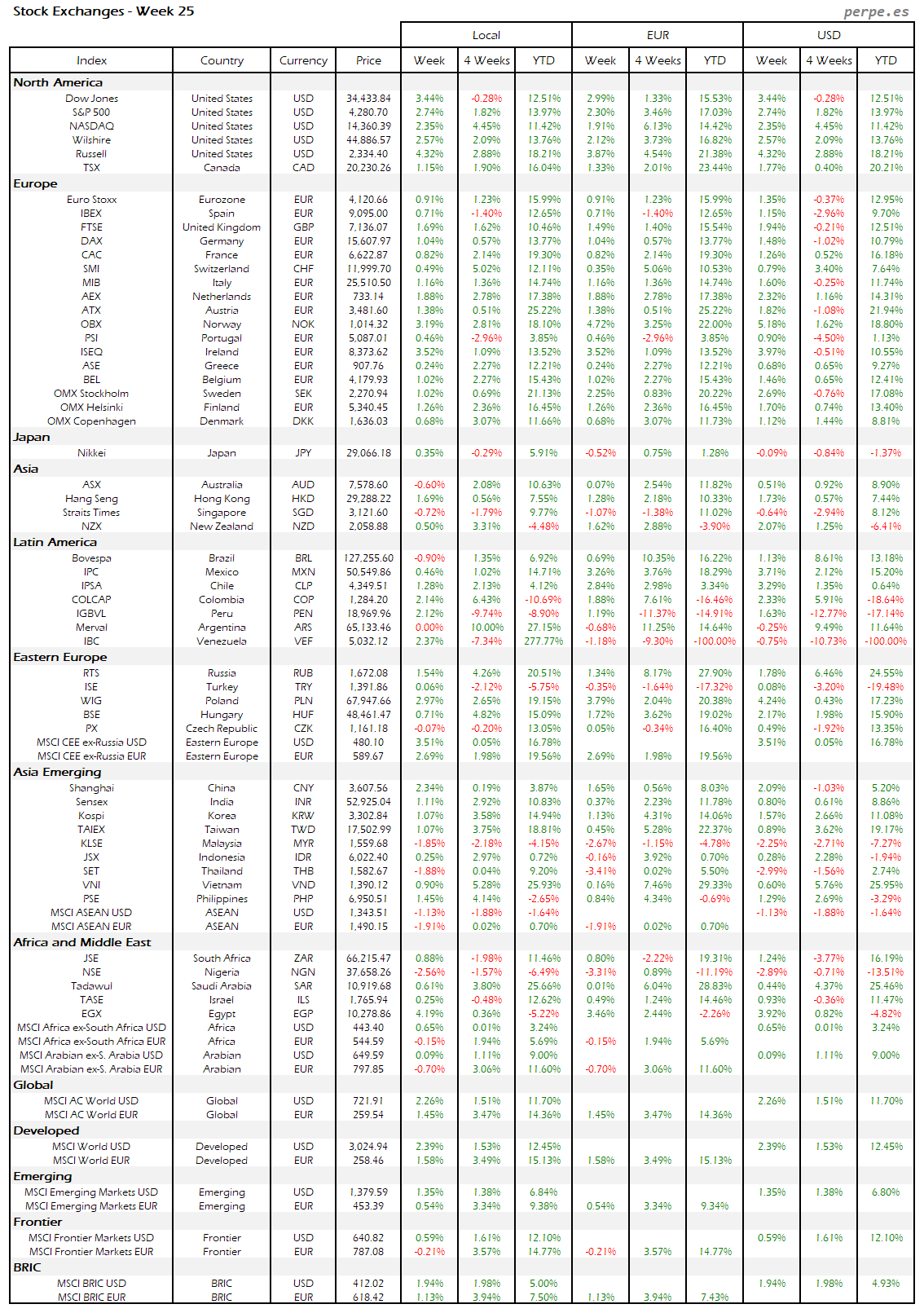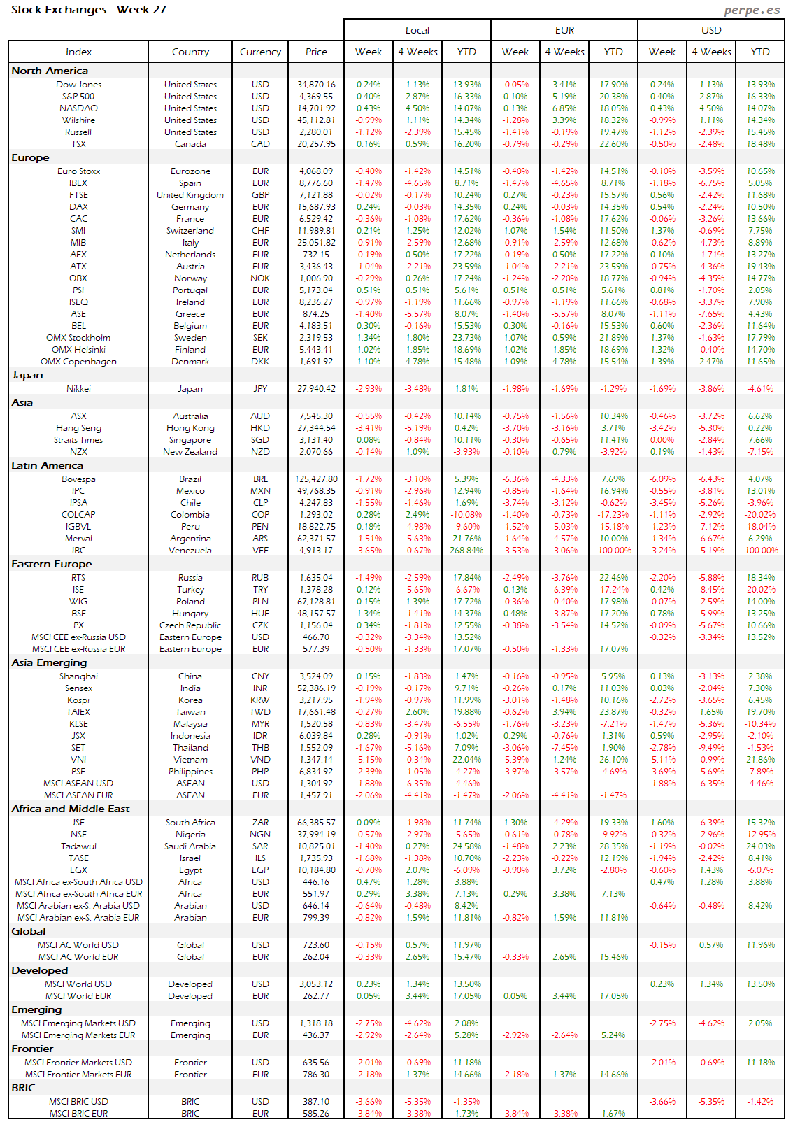 Subidas en la mayoría de bolsas europeas, aunque la española terminó con una bajada del 1.5% después de haber subida durante las 7 semanas anteriores. También Portugal quedó entre las peores, incluso a nivel mundial, cayendo un 2%. Varias bolsas en América Latina registraron importantes subidas, destacando Perú, Brasil y Colombia.