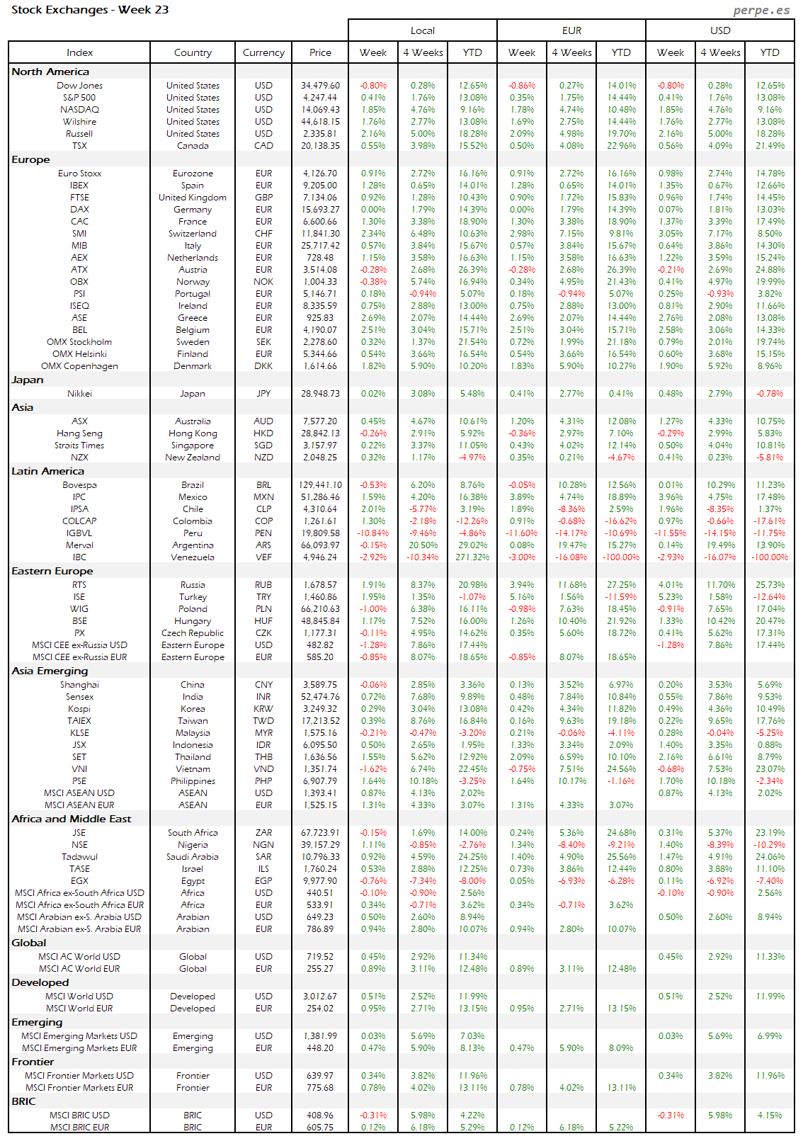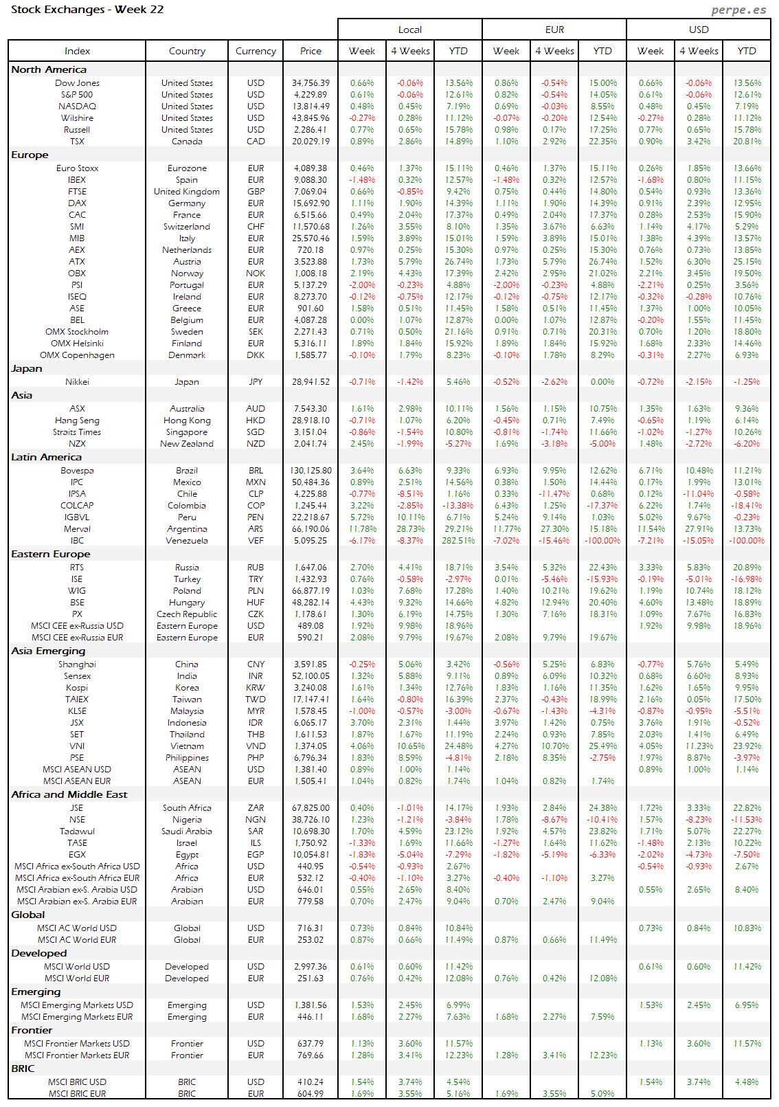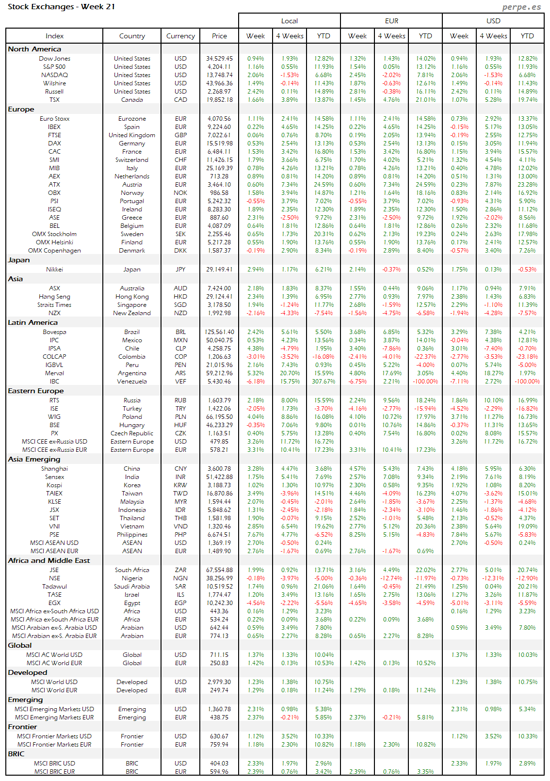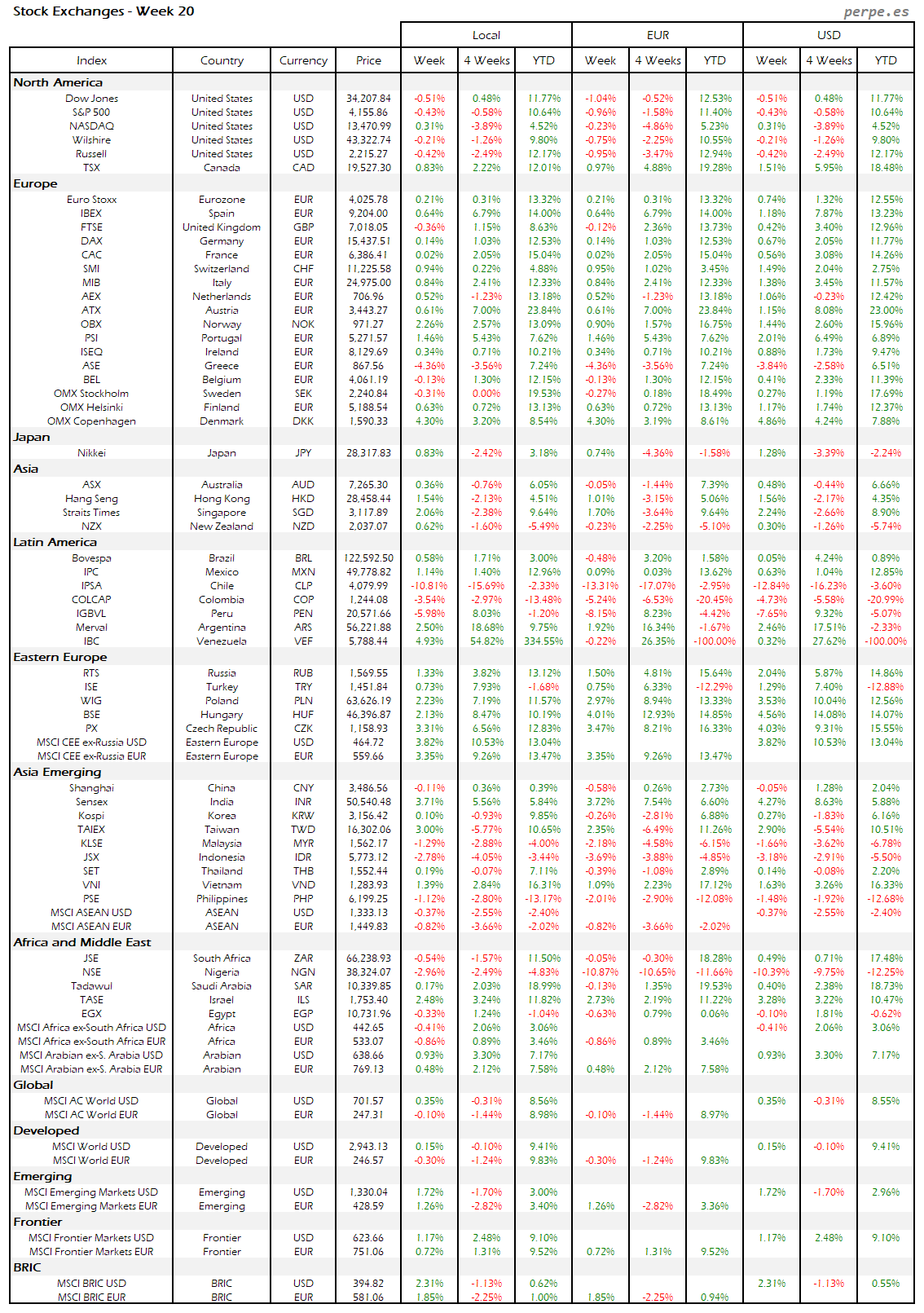 Subidas en la mayoría de bolsas europeas, aunque la española terminó con una bajada del 1.5% después de haber subida durante las 7 semanas anteriores. También Portugal quedó entre las peores, incluso a nivel mundial, cayendo un 2%. Varias bolsas en América Latina registraron importantes subidas, destacando Perú, Brasil y Colombia.
