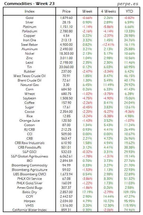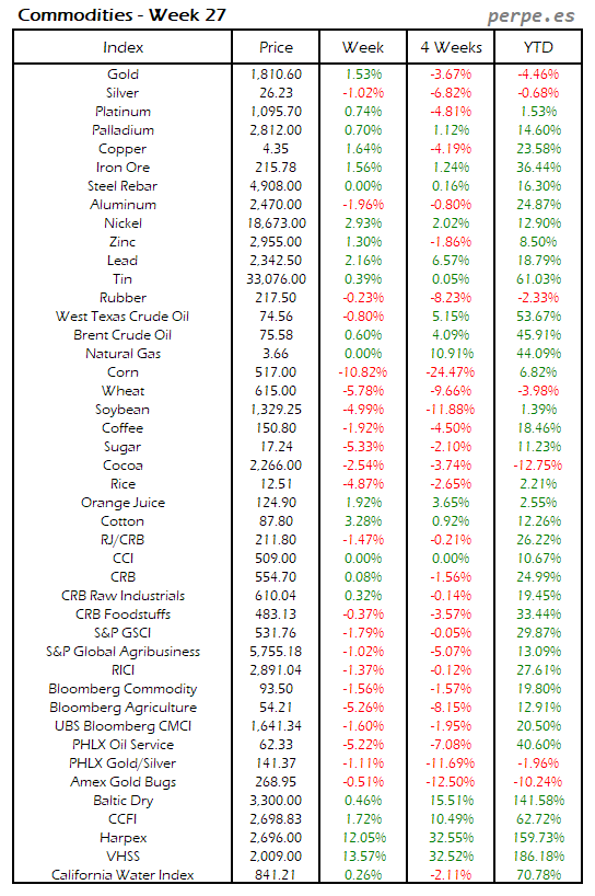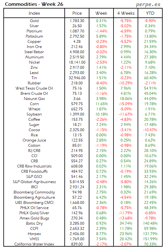 Subida generalizada de las materias primas, si bien tanto el oro como la plata y varios metales industriales terminaron la semana en negativo. El petróleo West Texas subió casi un 5%, mientras que el Brent lo hizo más moderadamente un 3%. Trigo, maíz y soja subieron también alrededor del 3.5%. En lo que va de año, tan sólo el cacao y el oro registran caídas.