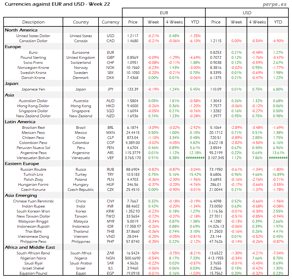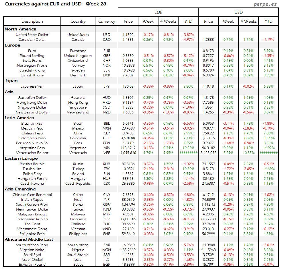 Apreciación del dólar frente al euro, de manera que éste año sube algo más del 1%. Vuelven las caídas a la lira turca, que baja ya casi 16% frente al dólar en lo que va de año. El yuan sigue subiendo, quedando esta semana entre las que más se apreciaron junto al real brasileño y won surcoreano.