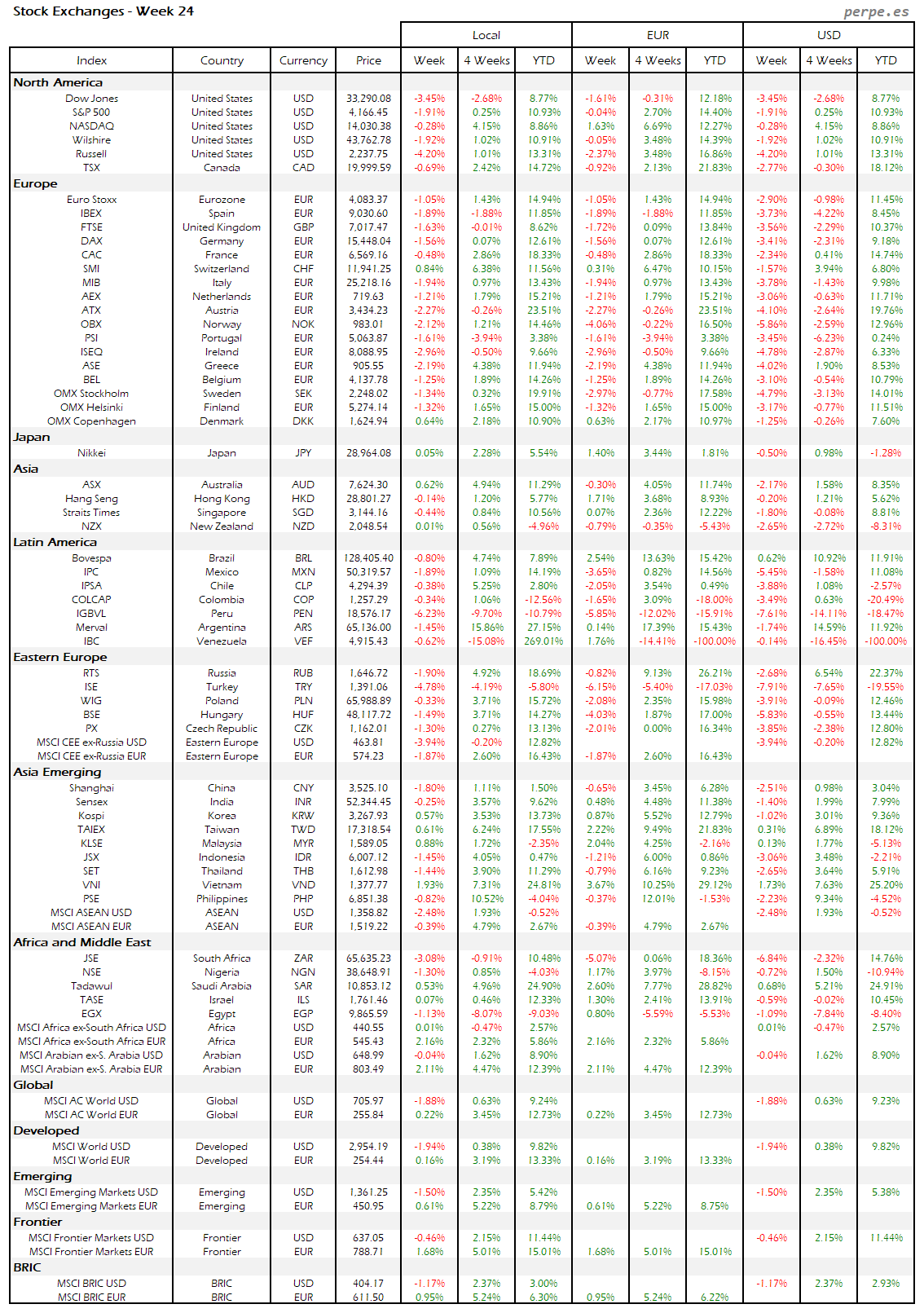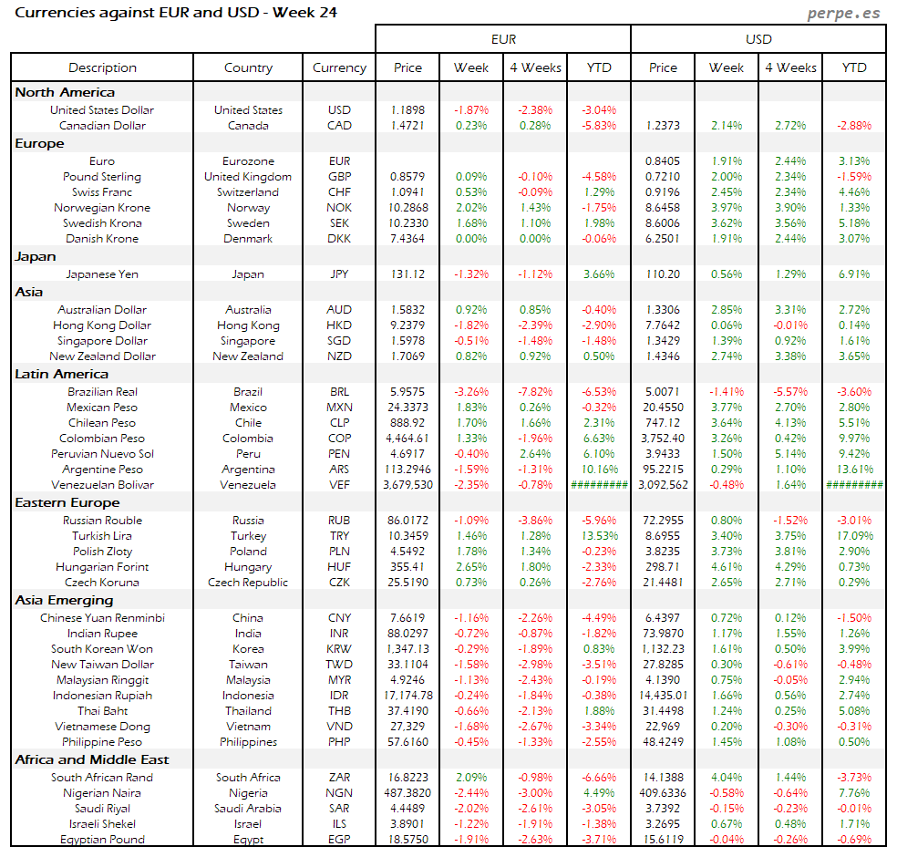 Resumen semanal bolsas, divisas y materias primas: Semana 24
