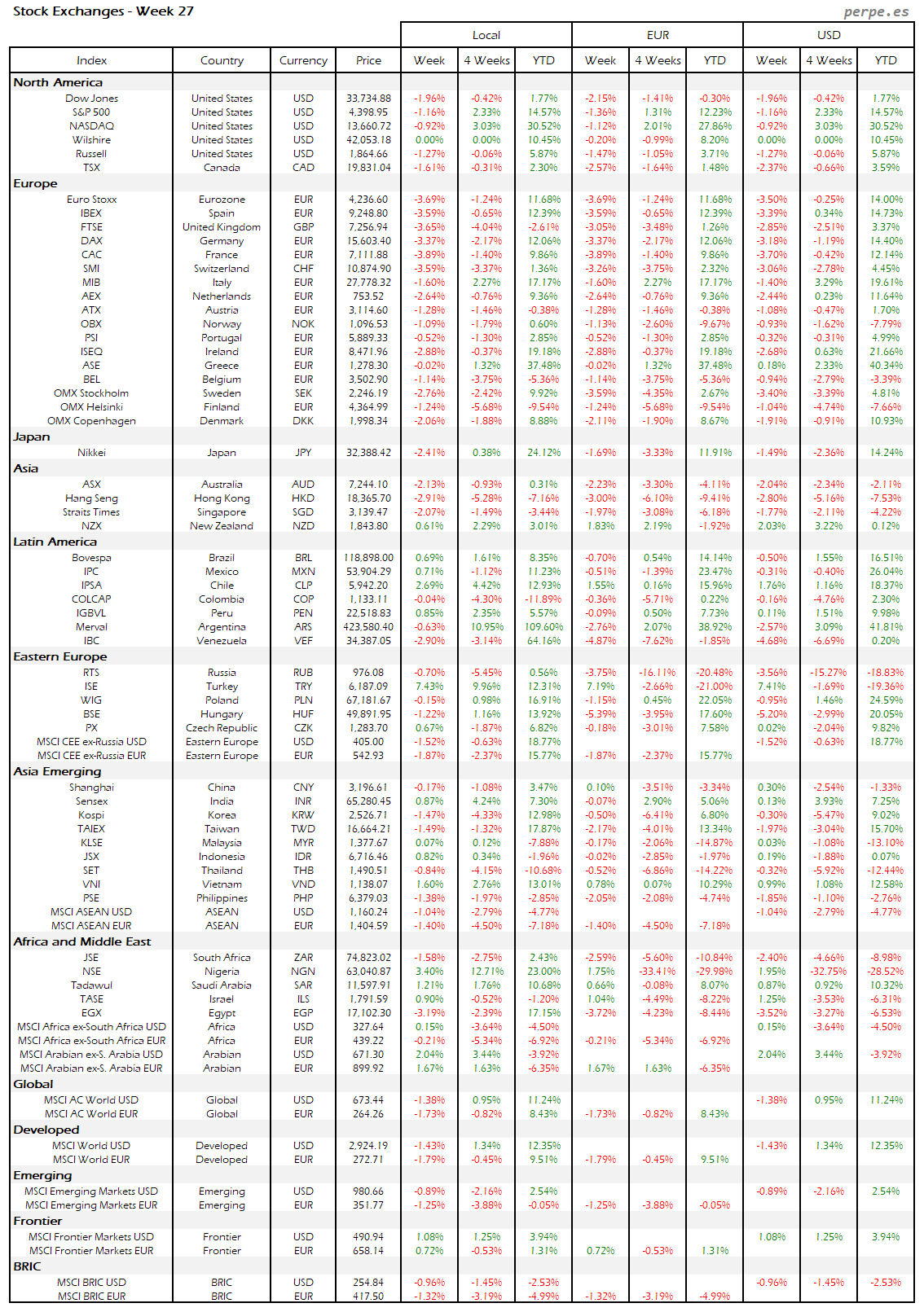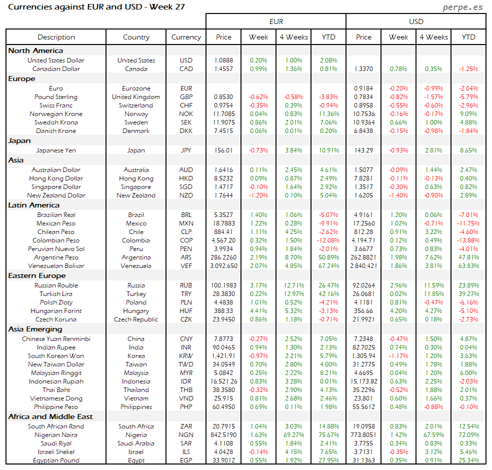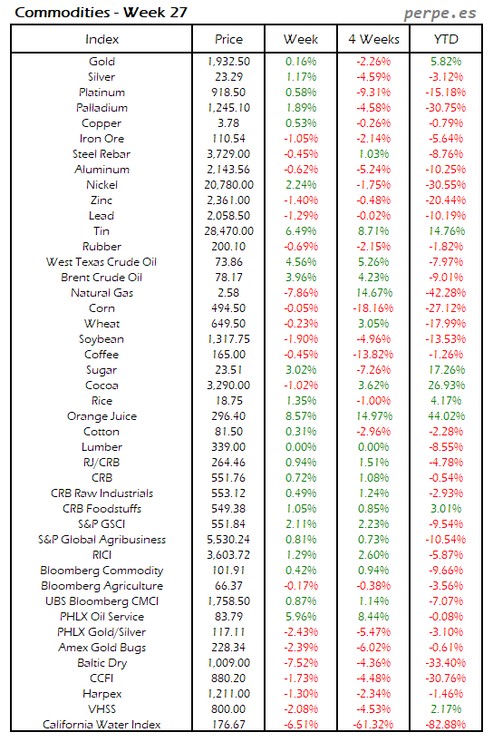 Resumen semanal bolsas, divisas y materias primas: Semana 27
