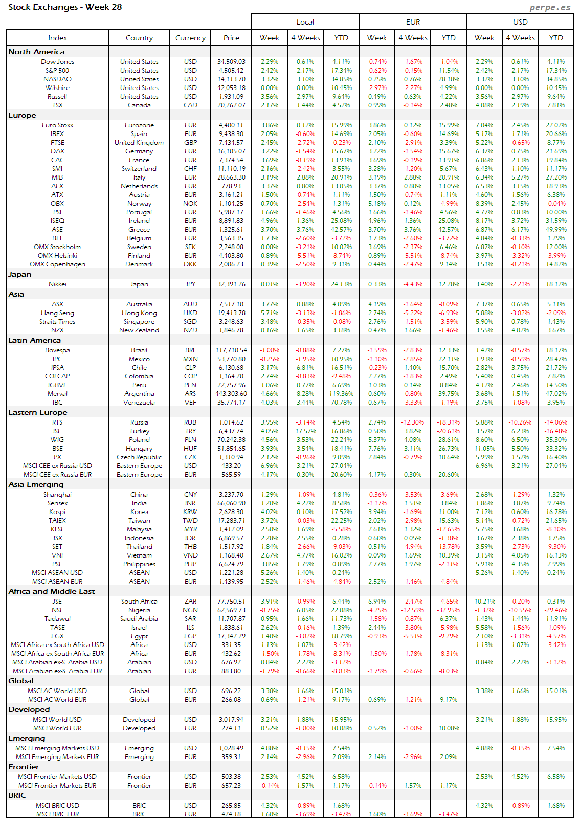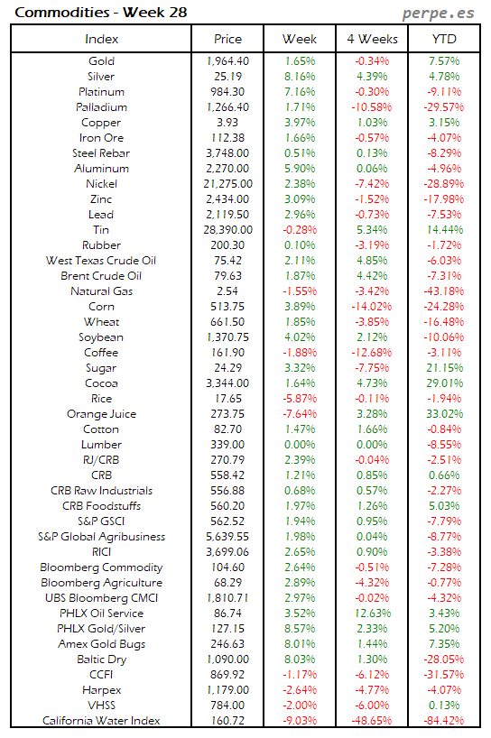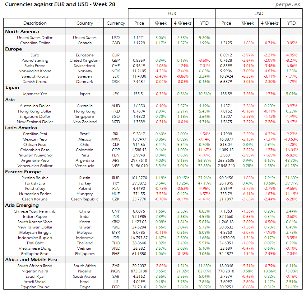 Resumen semanal bolsas, divisas y materias primas: Semana 28